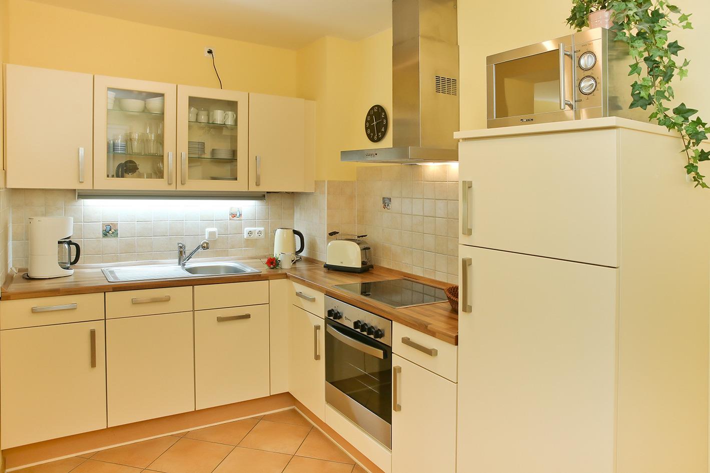 Unsere moderne Küche ist mit allem ausgestattet, was das Herz begehrt: Geschirrspüler, Backofen, Cerankochfeld, Kaffeemaschine, Toaster, Kühlschrank mit Gefriermöglichkeit, Mikrowelle und Wasserkocher. Geschirr und Gläser sind natürlich ausreichend vorhanden.