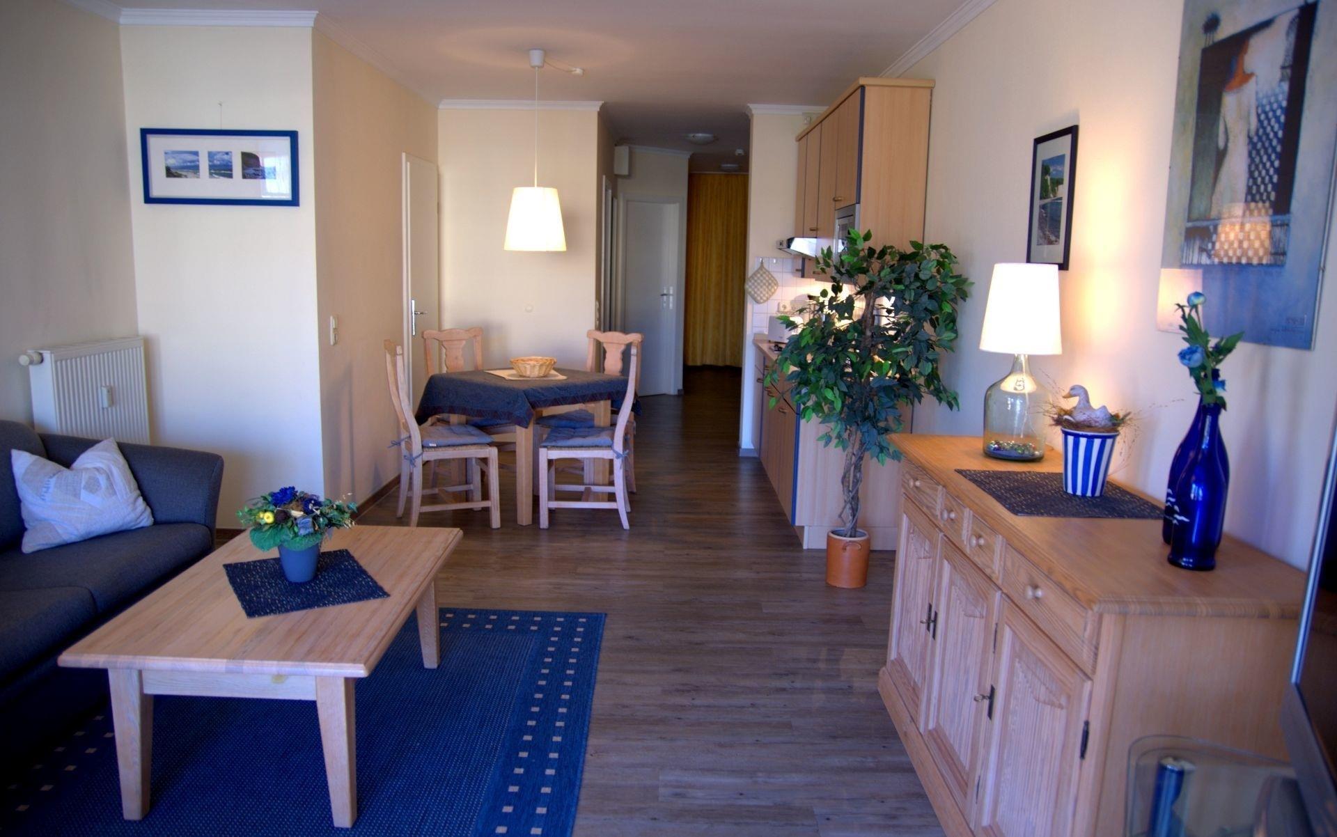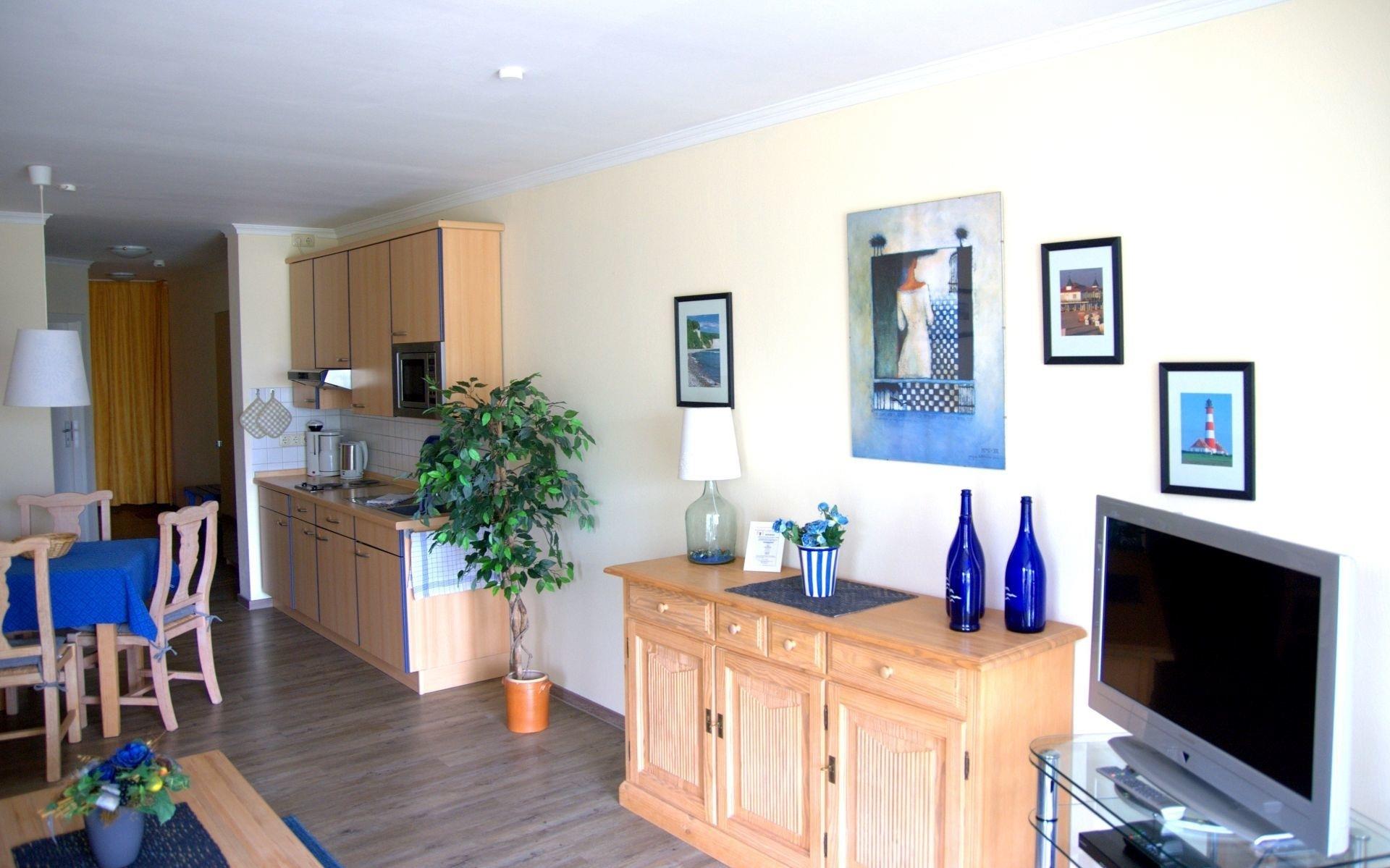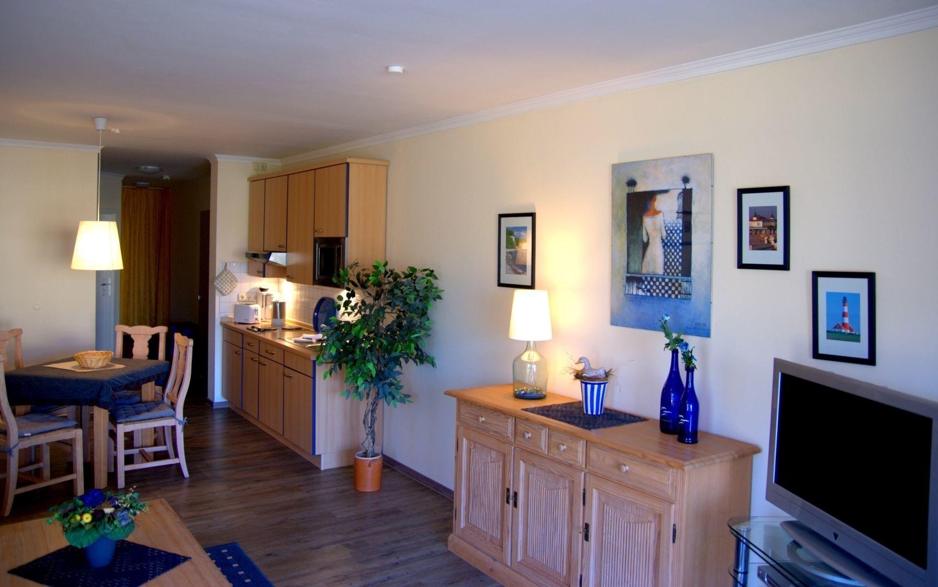 Das Ferienappartement selbst besteht aus einem großen, hellen Wohnzimmer mit breiter Fensterfront zur Loggia, einer Essecke mit integrierter Pantryküchenzeile, einem separaten Schlafzimmer, sowie einem Bad mit WC und Dusche. Für Kinder bietet die Wohnung auch an Regentagen genügend Platz zum Spielen.