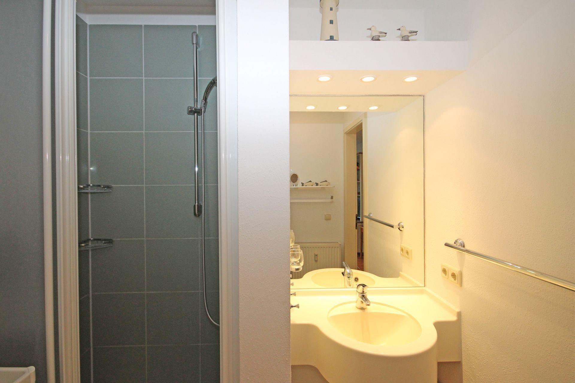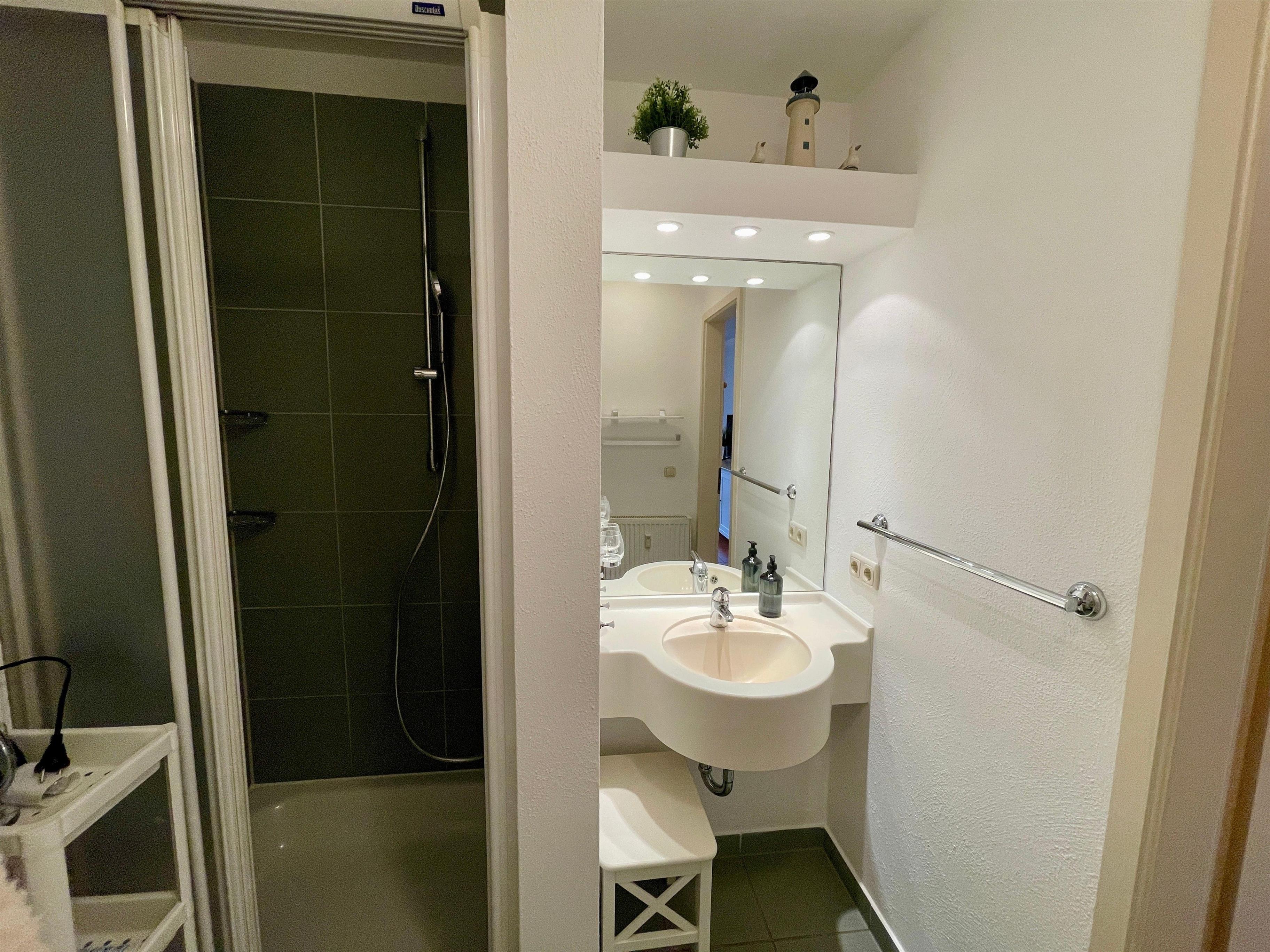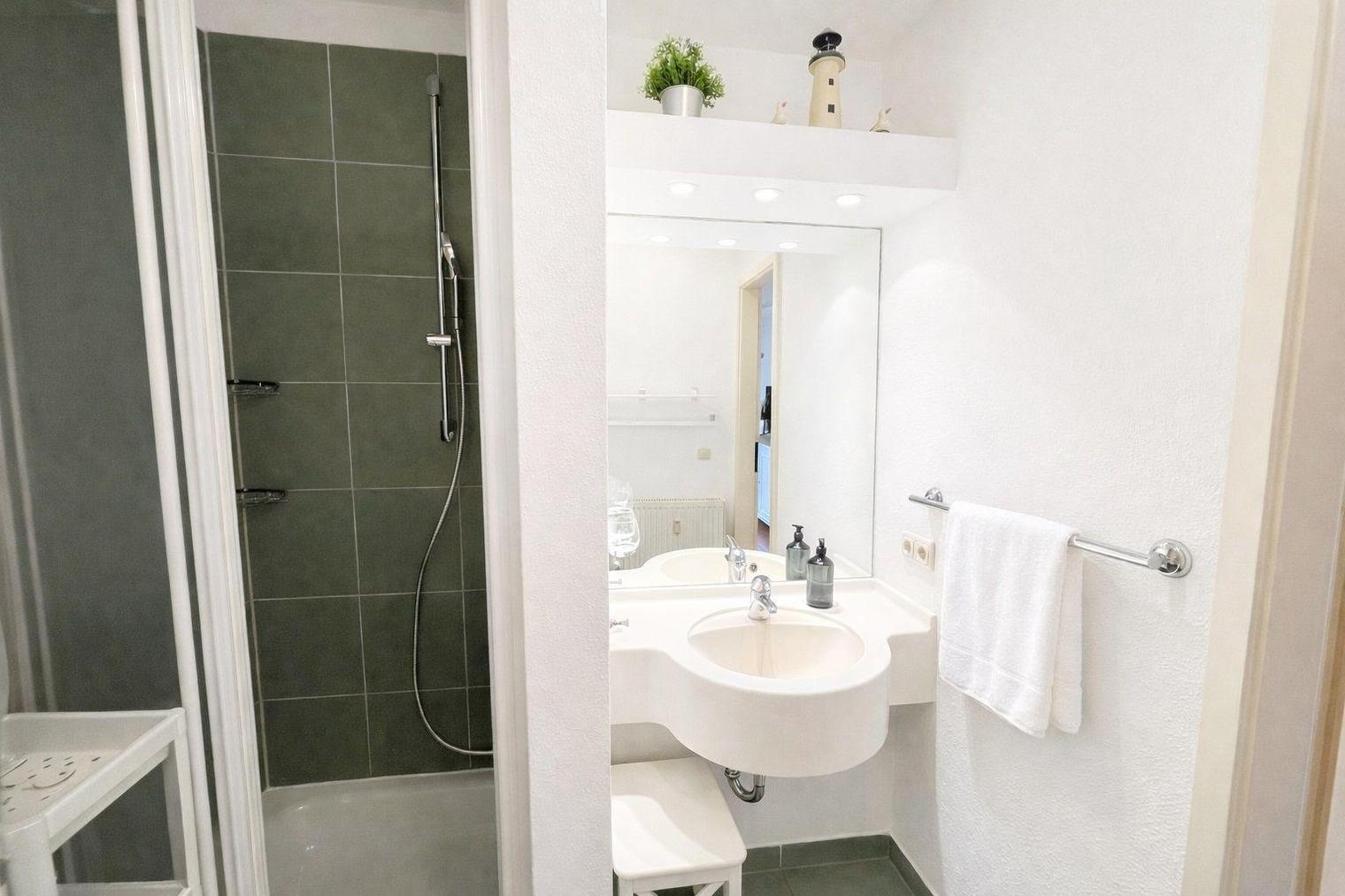 Das Bad mit Dusche und WC ergänzt die geschmackvoll eingerichtete Wohnung.