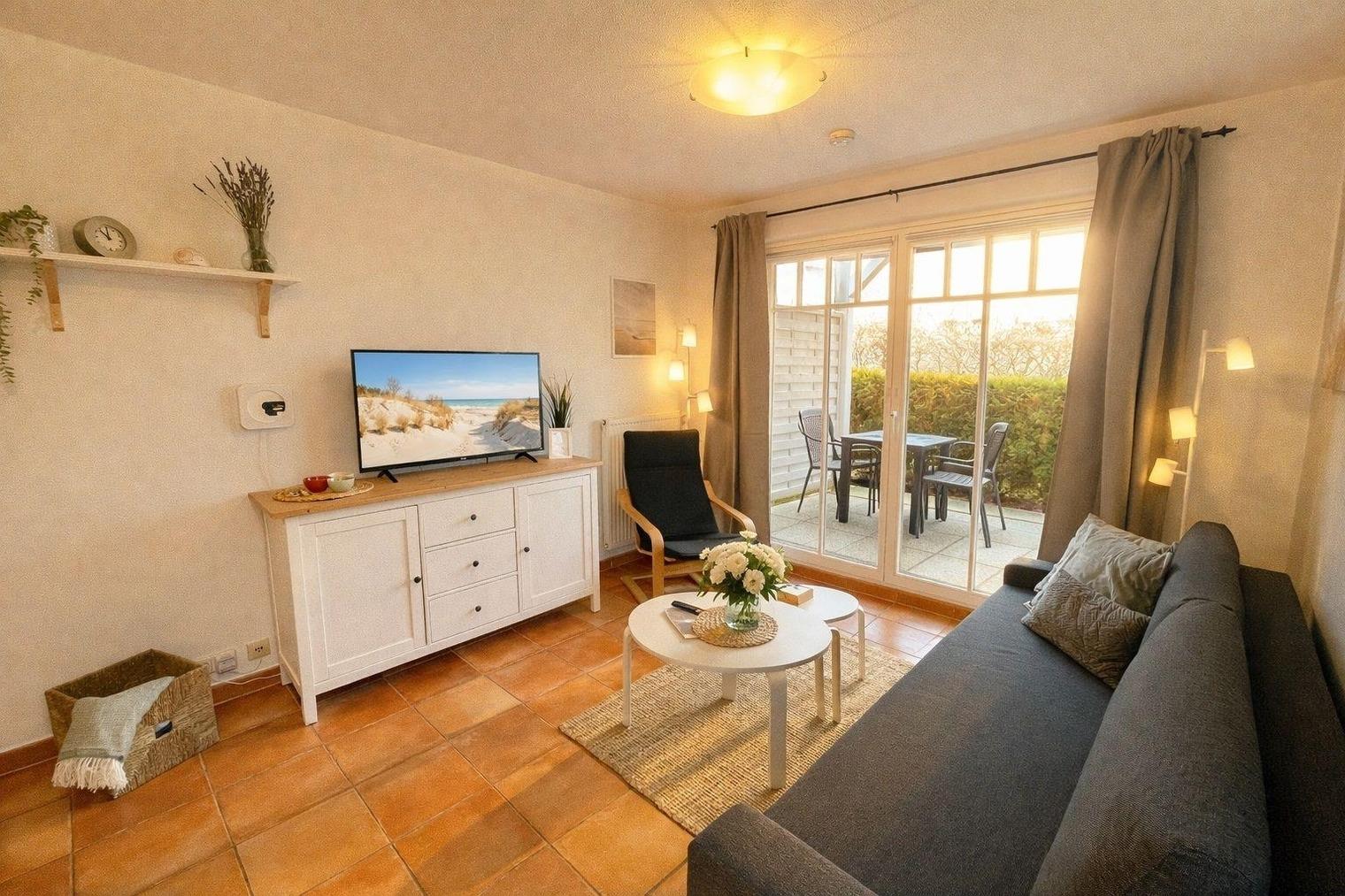 An das Wohnzimmer grenzt eine Terrasse mit einem Tisch und Gartenstühlen. Hier können Sie den Tag bei einem Glas Rotwein mit einem Gespräch oder einem schönen Buch ausklingen lassen.