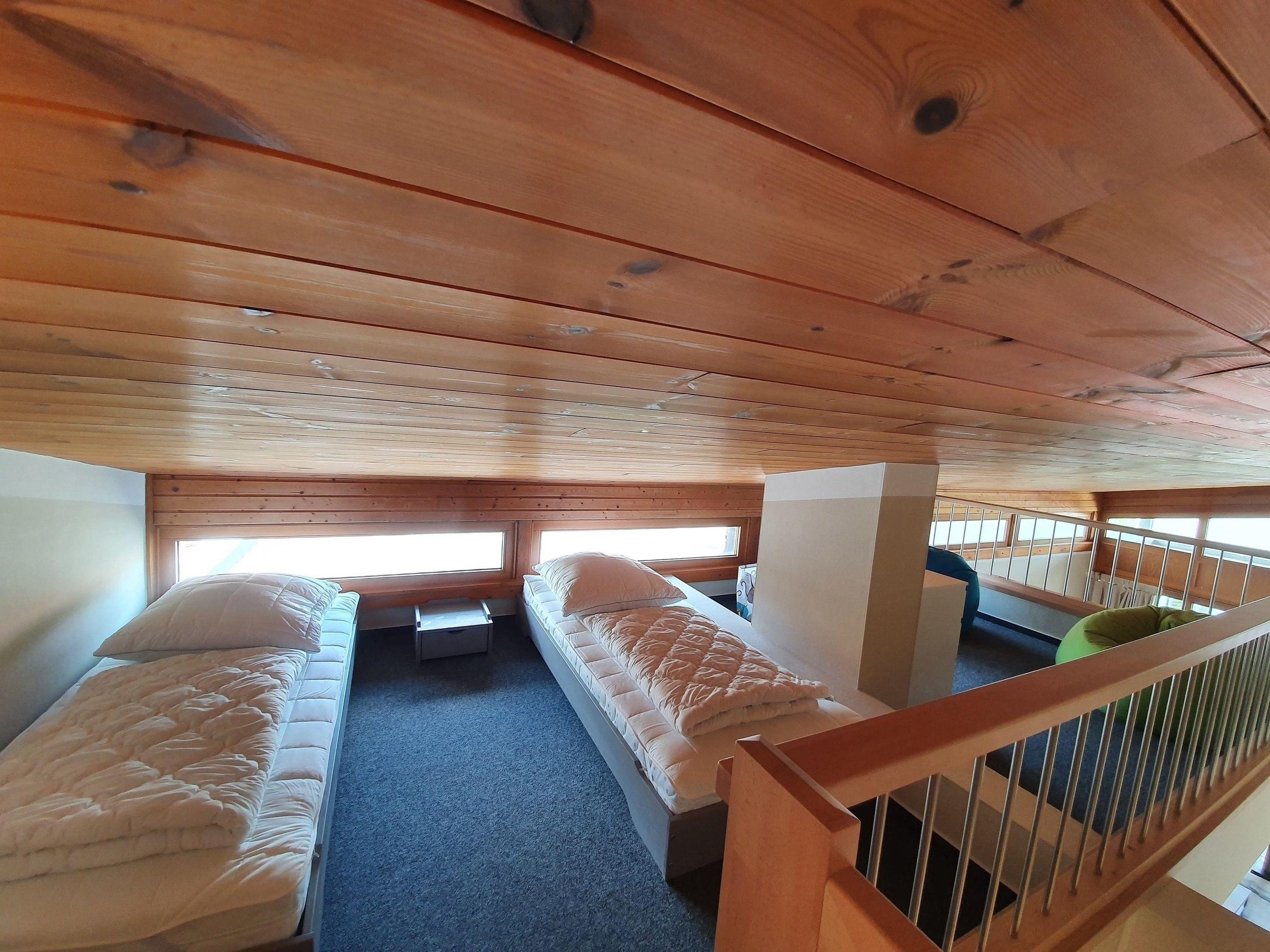 Vom Flur aus gelangen Sie über eine Holztreppe zum ausgebauten Dachgeschoss der Ferienwohnung, welches mit einem weiteren Doppelbett als Schlafbereich für 2 weitere Personen dient - ideal für Jugendliche und auch jung gebliebene Leute, die Ihre eigene Ruhezone im Urlaub benötigen. Der Bereich ist offen gehalten und ist durch ein Geländer gesichert.