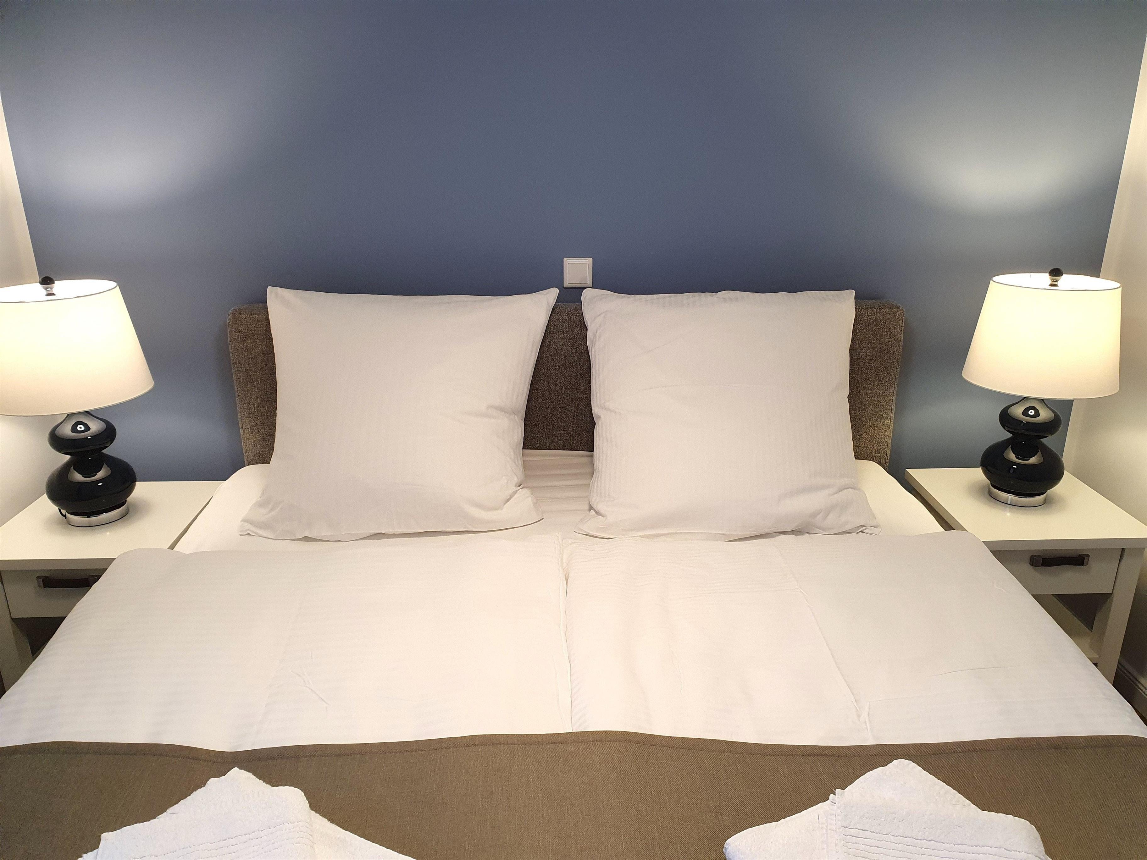 Beide Schlafzimmer sind mit einem großen, bequemen Boxspringbett (1,80 m Breite) für zwei Personen und einem geräumigen Kleiderschrank mit vielen Ablagemöglichkeiten für Ihre Garderobe eingerichtet.