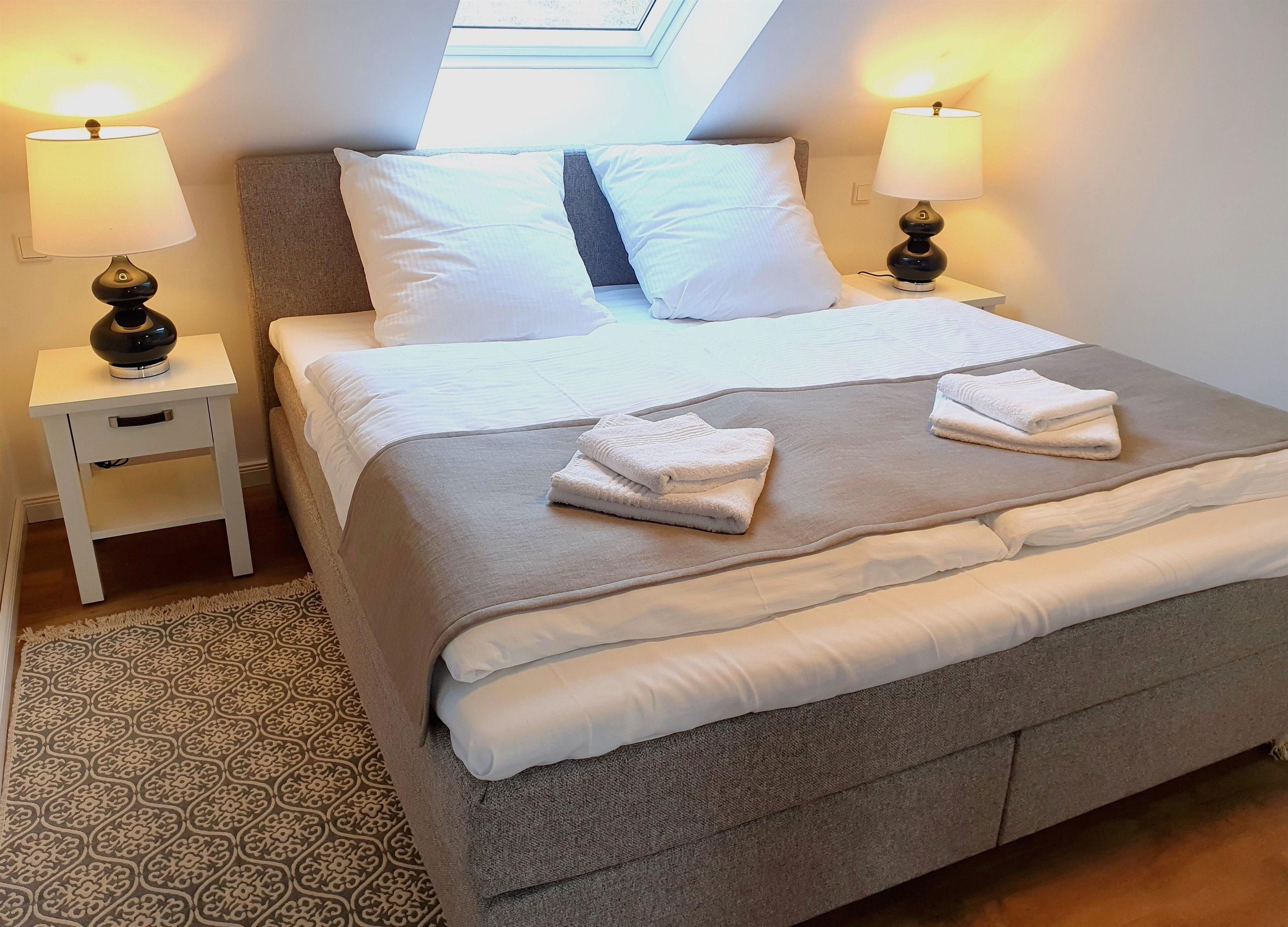 Das Schlafzimmer ist mit einem großen, bequemen Boxspringbett für zwei Personen und einem geräumigen Kleiderschrank mit vielen Ablagemöglichkeiten für Ihre Garderobe eingerichtet.