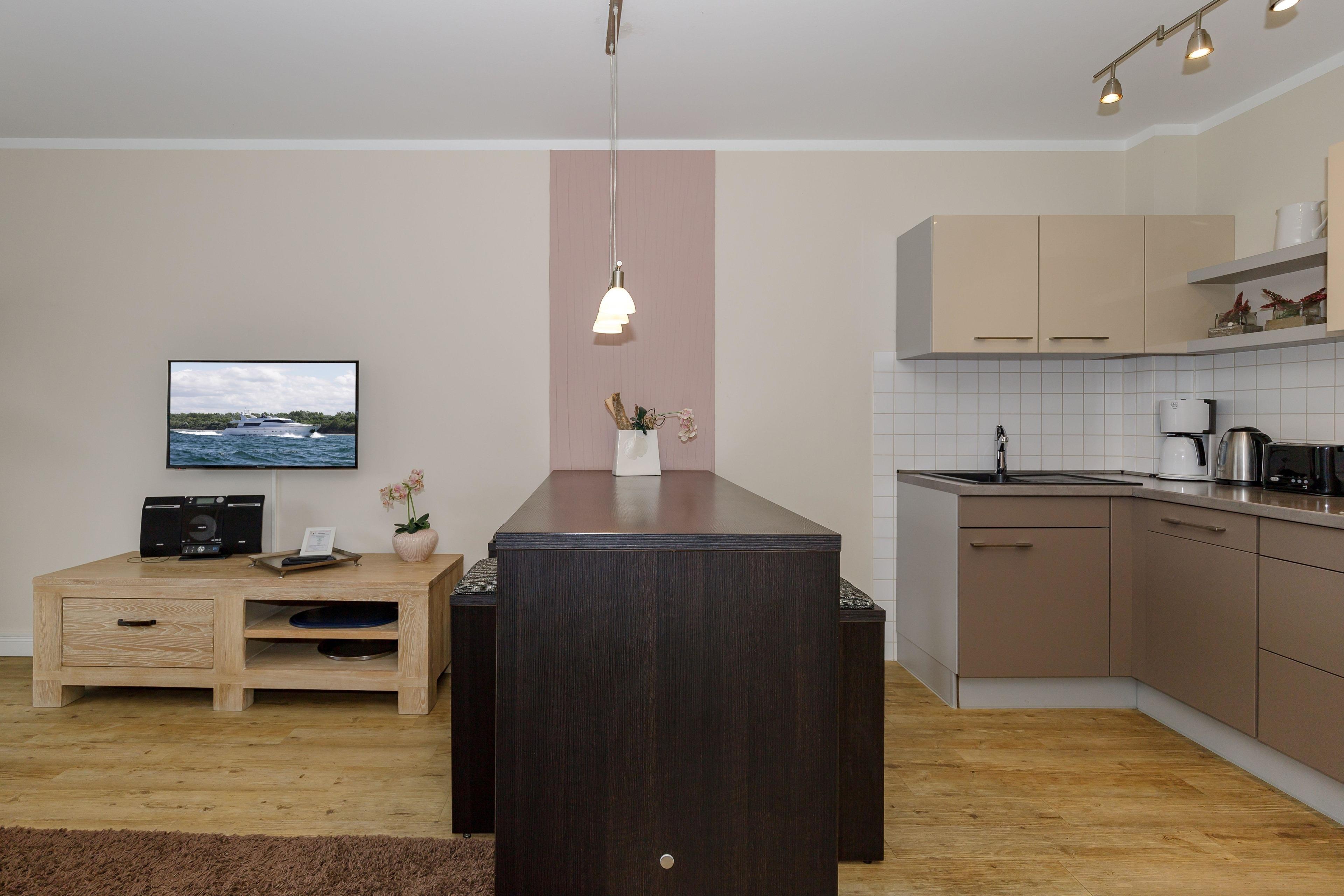 Die offene Küche grenzt direkt an den Wohnbereich. Die Küche ist voll ausgestattet, vom Besteck über Geschirr bis hin zu diversen Küchenutensilien. Natürlich ist auch eine Kaffeemaschine, ein Toaster, Wasserkocher, Cerankochfeld, Backofen, Kühlschrank und Geschirrspüler vorhanden.