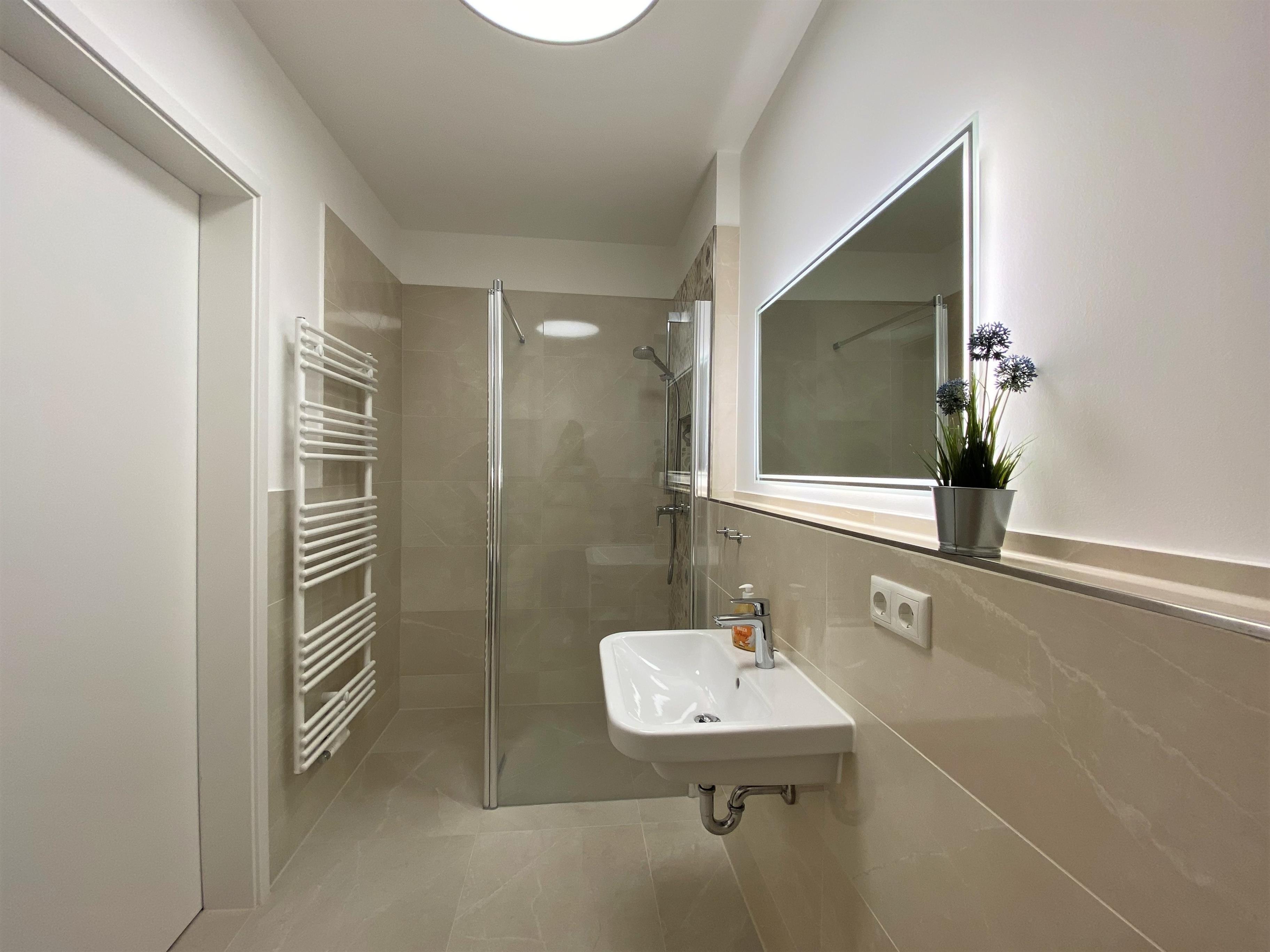 Das moderne Badezimmer ist mit Waschtisch, WC, ebenerdiger Dusche und Haarfön ausgestattet.