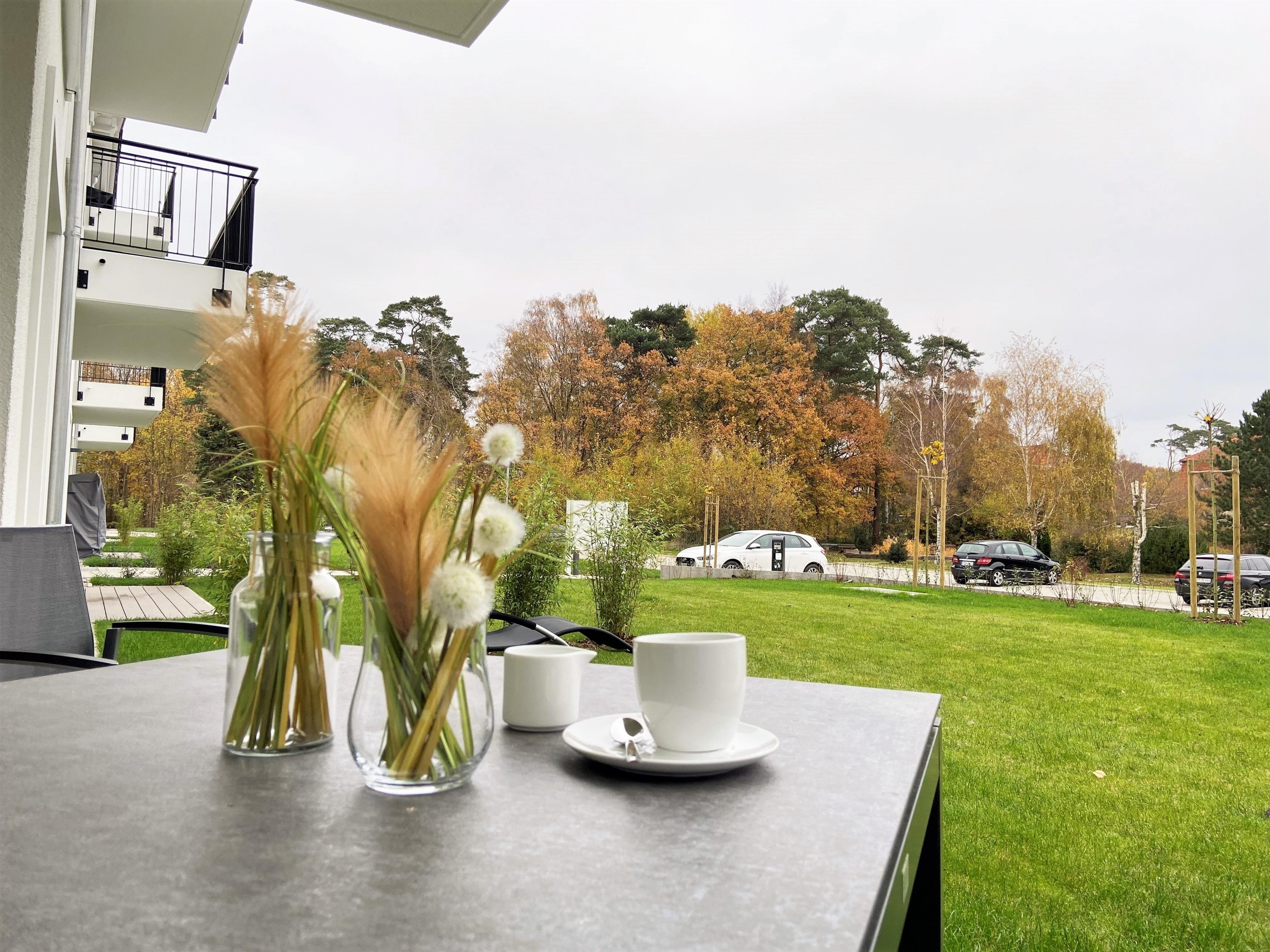Über den Wohnbereich gelangen Sie auf die nach Osten ausgerichtete, möblierte Terrasse mit angrenzenden Gartenfläche. Hier können Sie morgens gemütlich frühstücken und die ersten Sonnenstrahlen genießen.