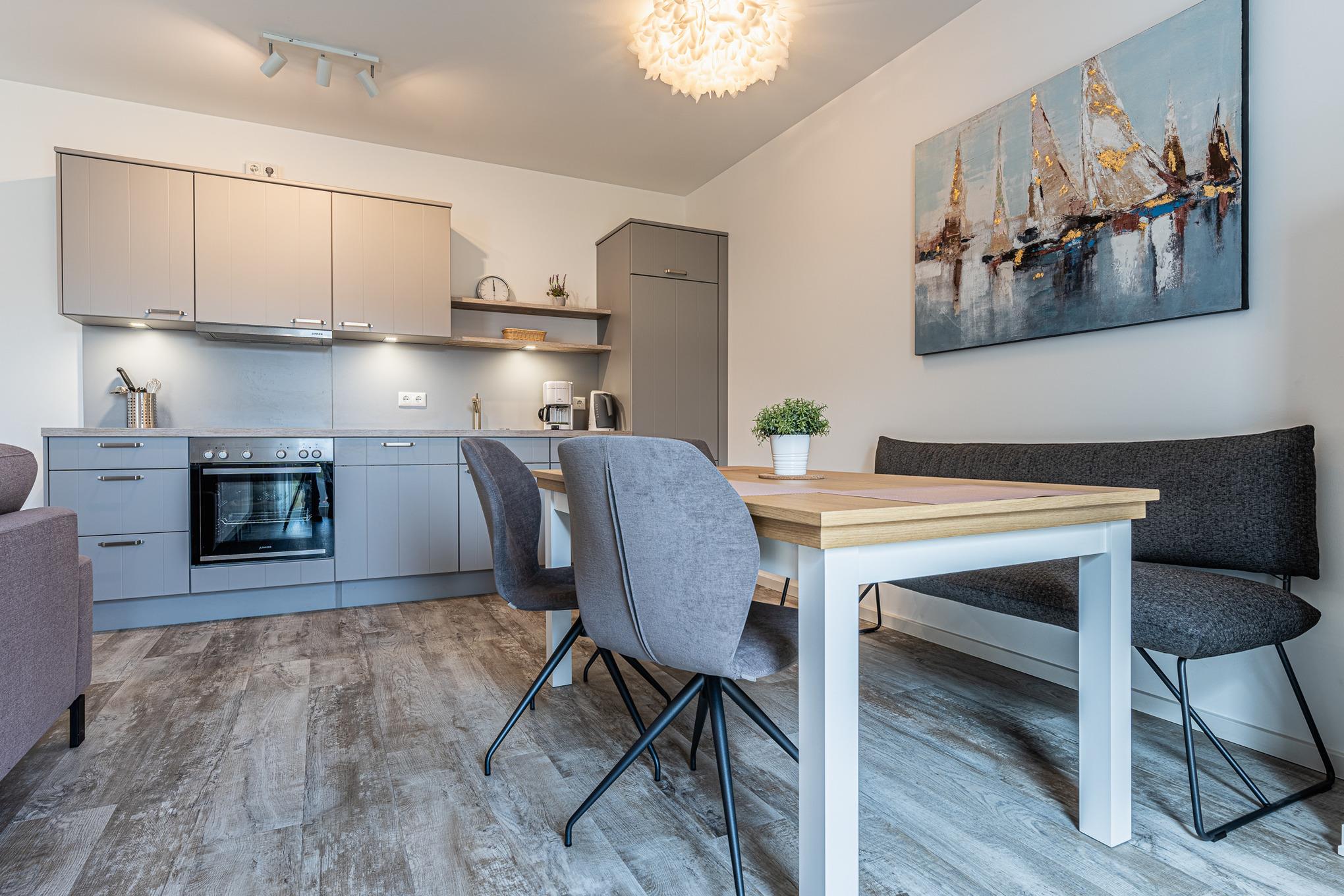 An den Wohnbereich schließt sich die komplett eingerichtete, hochwertige Küche an: Nebst Kühlschrank mit Gefrierfach, 4-Platten-Kochfeld und Backofen stehen Ihnen außerdem ein Geschirrspüler, Kaffeemaschine, Wasserkocher und Toaster zur Verfügung.