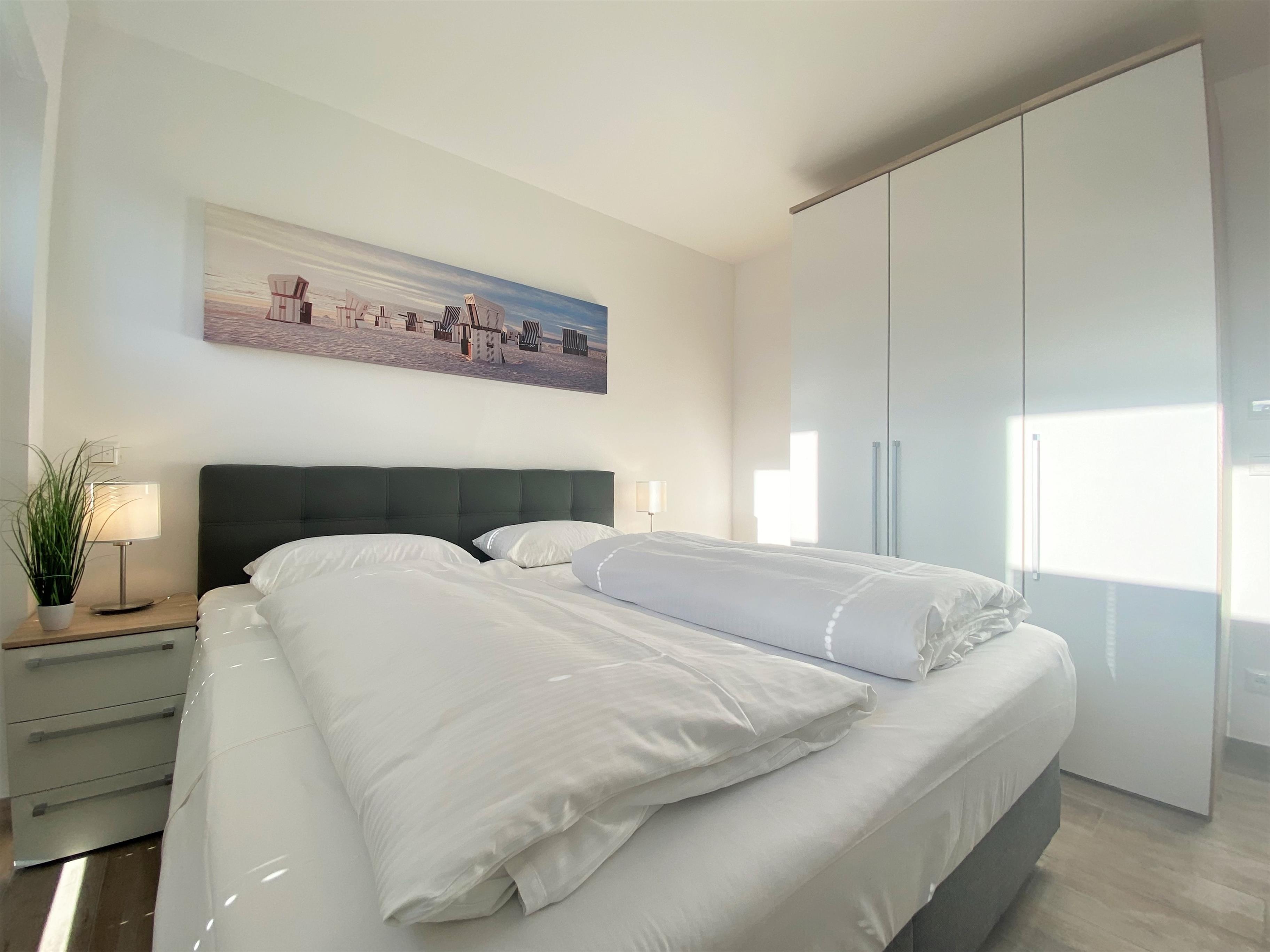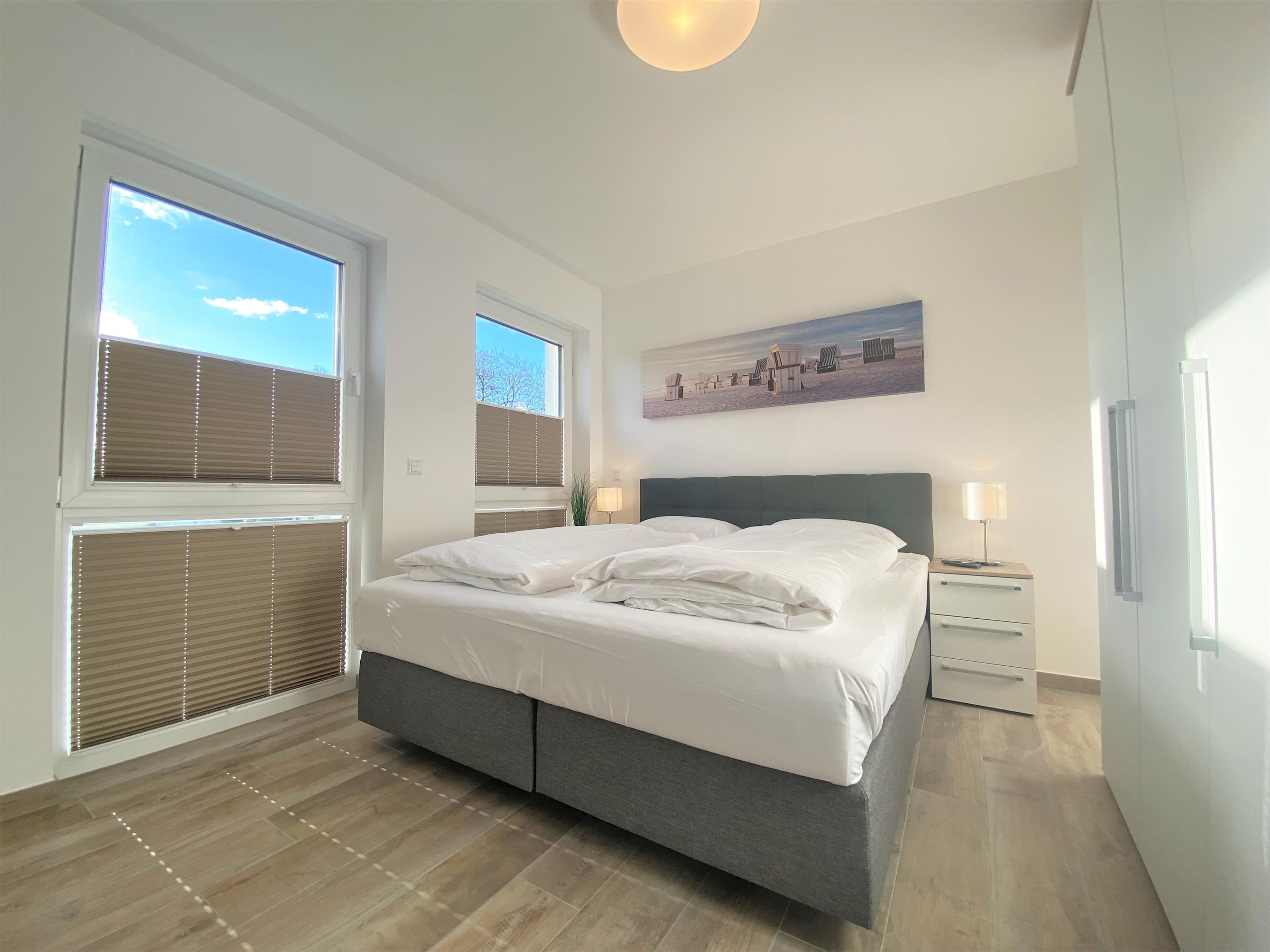 Das behagliche Schlafzimmer bietet Ihnen ein gemütliches Boxspringbett (1,80x2,00m, durchgängiger Topper), einen geräumigen Kleiderschrank mit viel Platz für die Urlaubsgarderobe sowie einen weiteren 43 Zoll Smart TV zum Entertainment.
