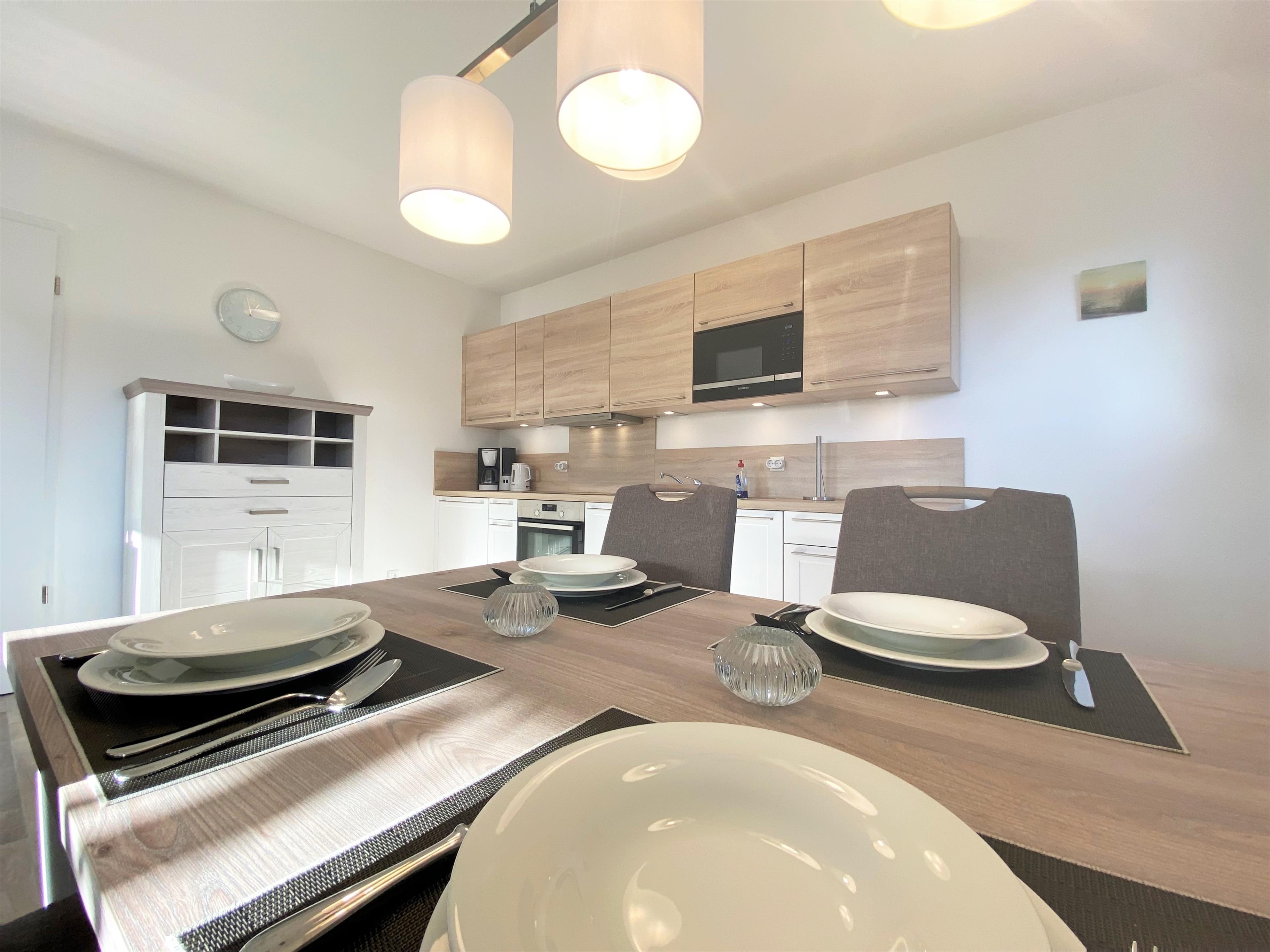An den gemütlichen Wohnbereich grenzt ein schöner Esstisch und eine modern eingerichtete Küche, ausgestattet mit Kühlschrank inkl. kleinem Gefrierfach, 4-Platten-Induktions-Kochfeld, Backofen, Geschirrspüler, Mikrowelle, Wasserkocher, Toaster und Kaffeemaschine.