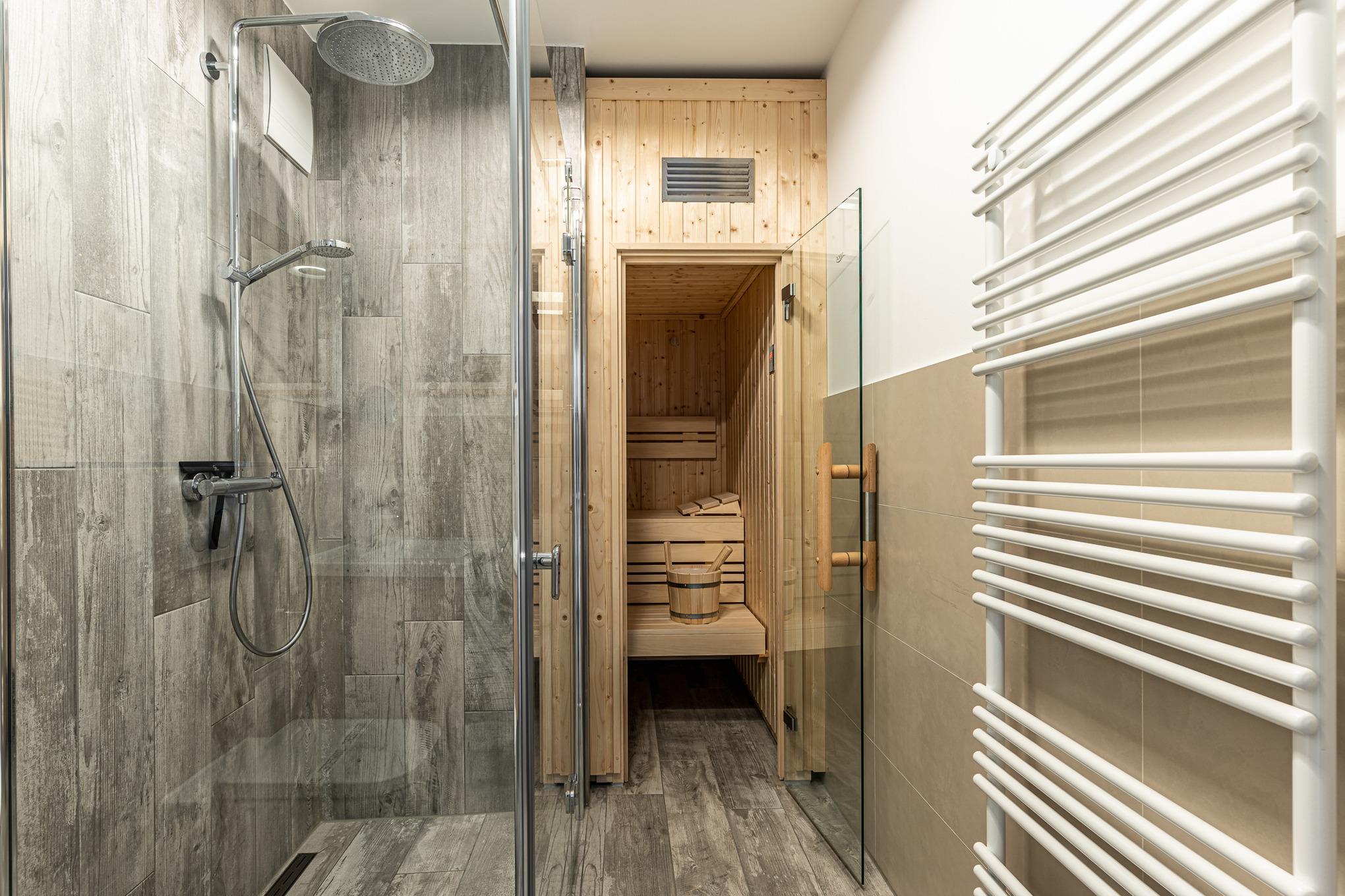 Das moderne Badezimmer ist mit Waschtisch, WC, Haarfön, Kosmetikspiegel und ebenerdiger Dusche ausgestattet. Über das Badezimmer gelangen Sie in Ihre eigene Privatsauna, welche Ihnen den gesamten Aufenthalt natürlich kostenfrei zur freien Verfügung steht. Der Einbau der Sauna erfolgt spätestens im Herbst 2021, eine Nutzung ist ab dem 01.11. garantiert.