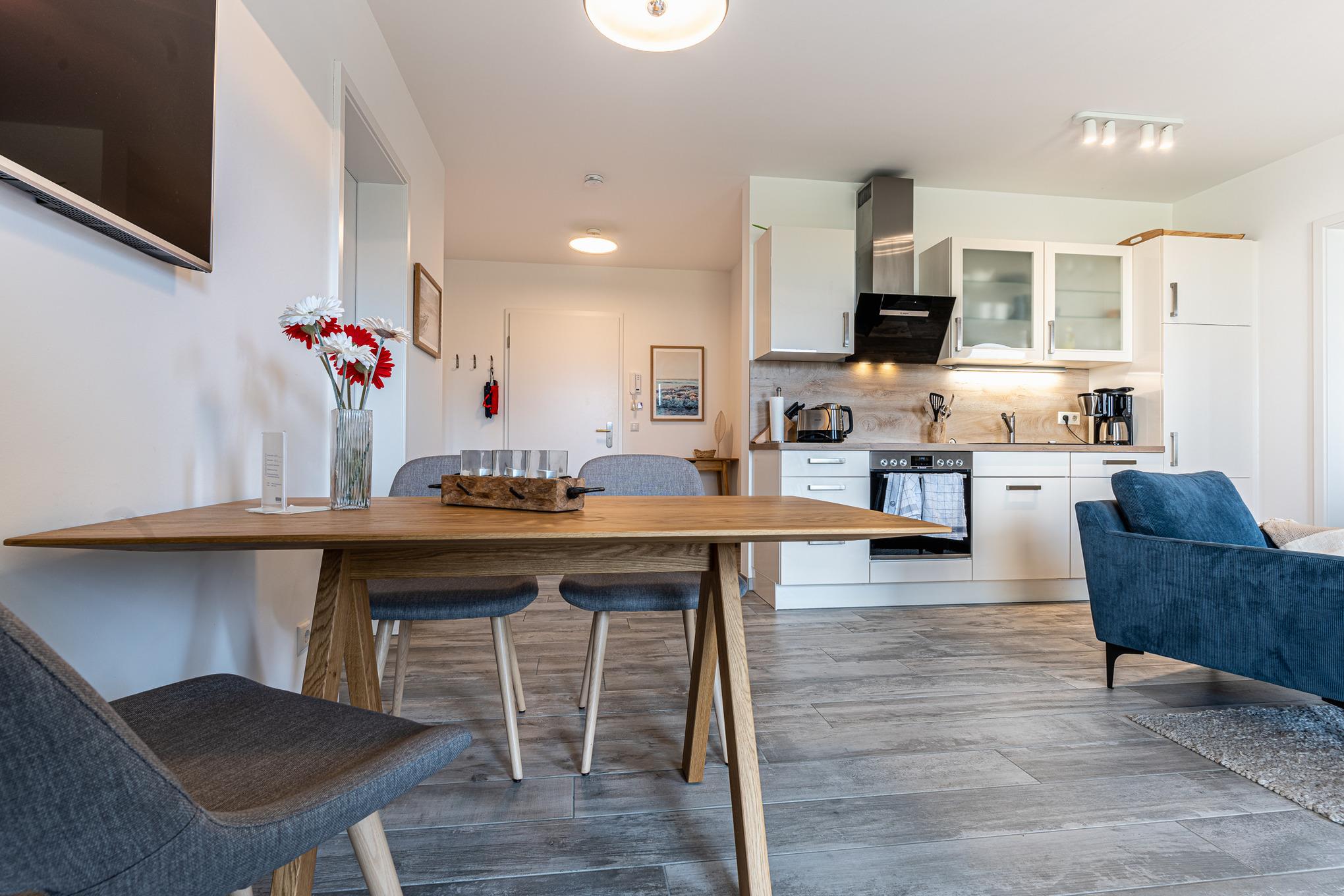 Das kombinierte Wohn/Esszimmer mit offener Küche bietet mit seiner hochwertigen Einrichtung ein gelungens Ambiente. Der Wohnbereich ist mit einer gemütlichen Couch, welche sich in nurwenigen Handgriffen zu einer weiteren Schlafmöglichkeit (z.B. als Ausweichmöglichkeit für Schnarcher oder für 5. + 6. Person) umfunktionieren lässt, sowie einen großem Flatscreen ausgestattet. An dem integrierten Esstisch findet sich genügend Platz für bis zu 6 Personen.