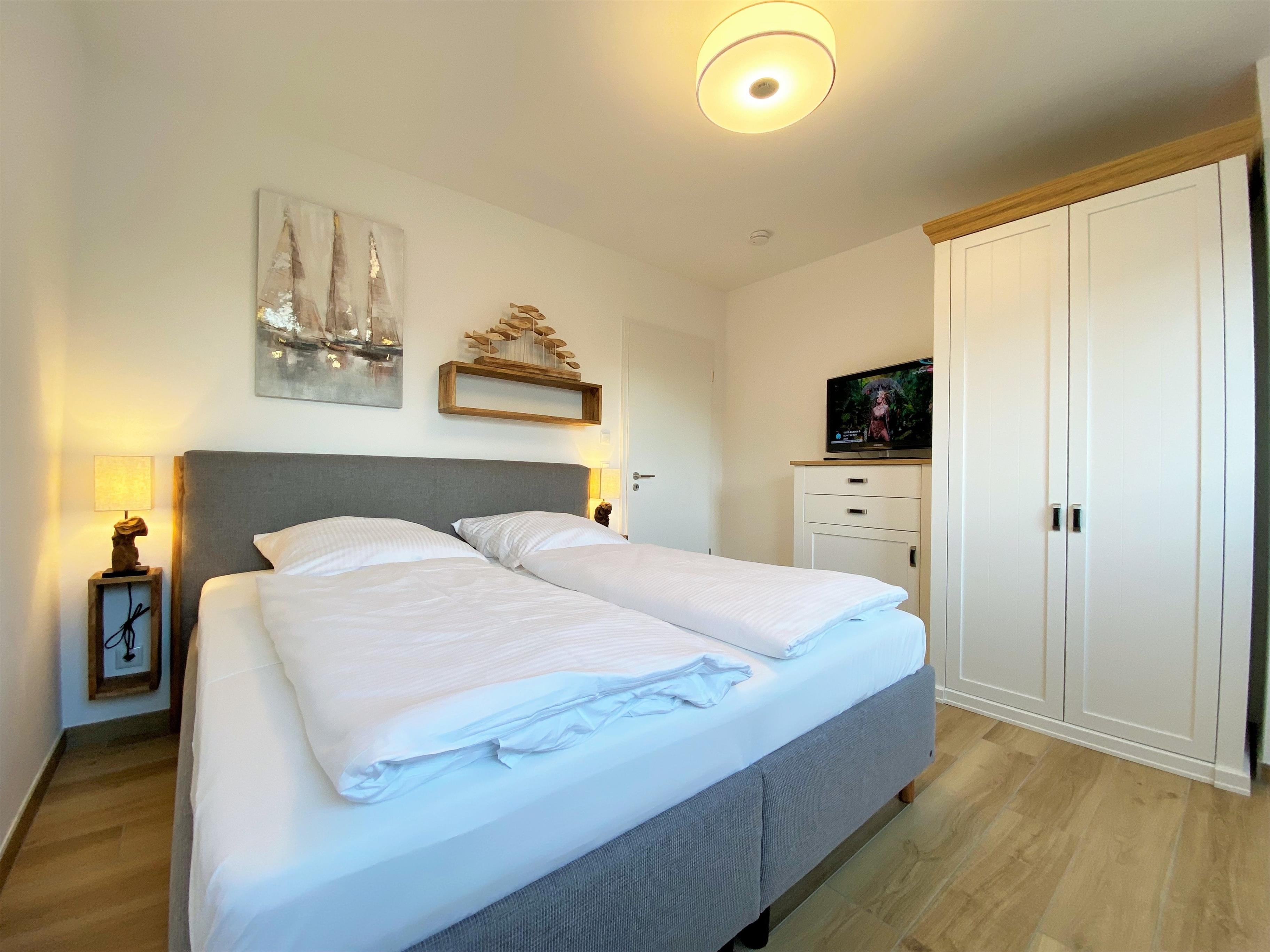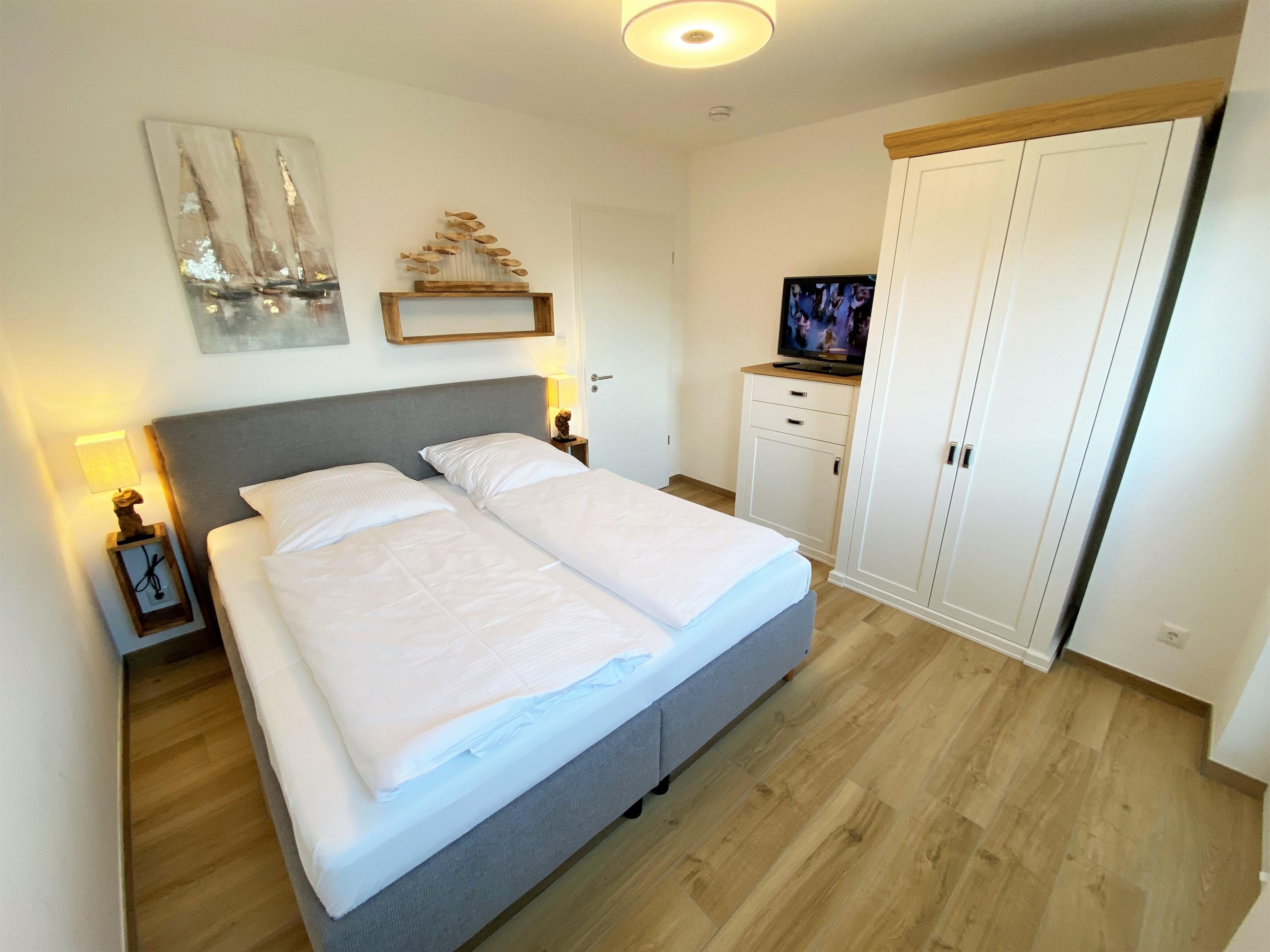 Das hochwertige Schlafzimmer bieten Ihnen ein gemütliches Polsterbett (1,80m x 2,00m, durchgehender Topper) für einen erholsamen Schlaf. Ein schöner Kleiderschrank und eine kleine Kommode bieten viel Platz für die mitgebrachte Urlaubsgarderobe. Für das abendliche Entertainment steht Ihnen auch hier ein Flat-TV zur Verfügung. Die Fenster sind mit einem Fliegenschutz versehen.