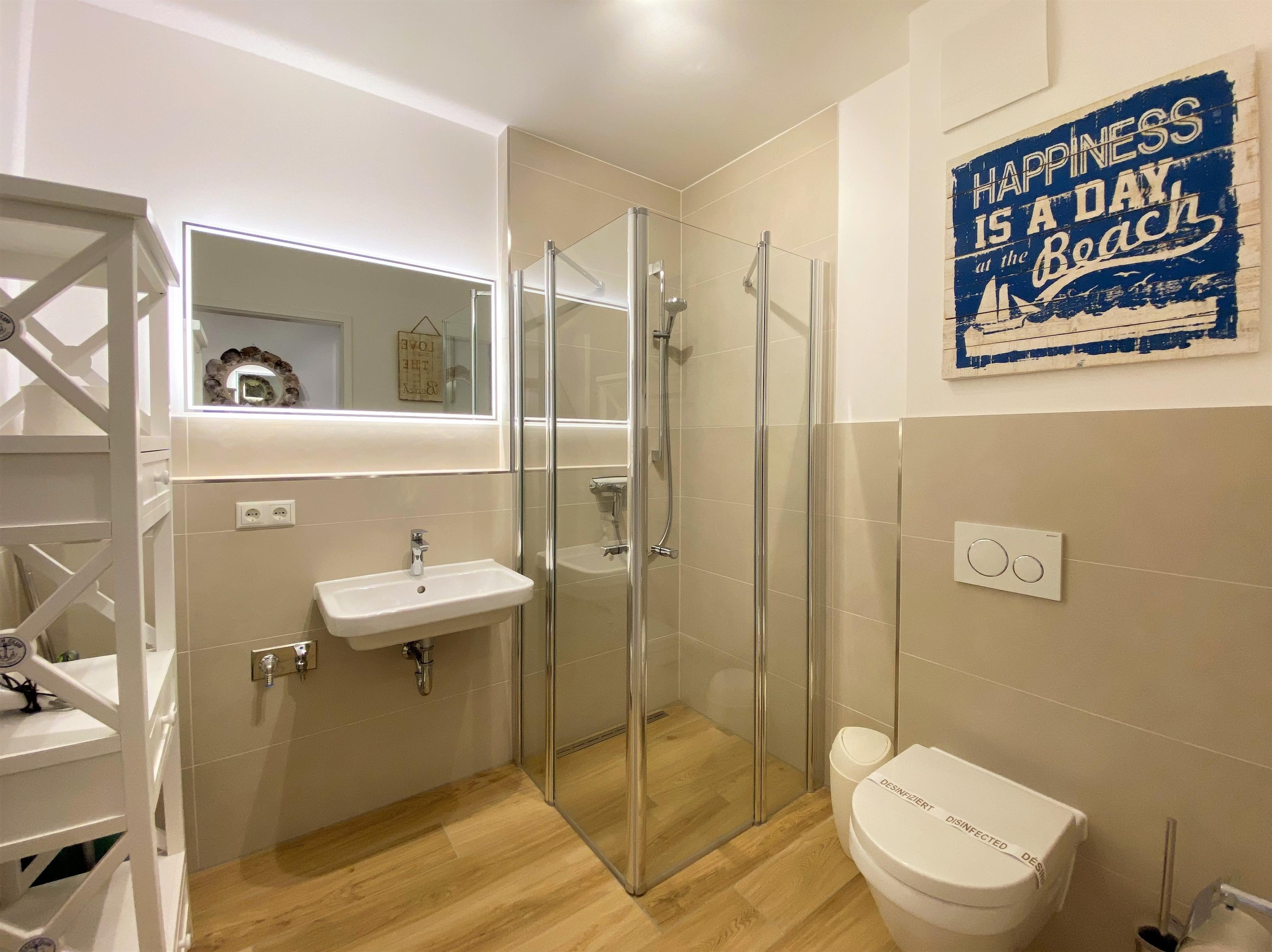 Das moderne Bad ist geschmackvoll ausgestattet und bietet Ihnen nebst WC eine ebenerdige Dusche mit Echtglasabtrennung, sowie einem Waschbecken mit Lichtspiegel, Haarfön und genügend Ablagemöglichkeiten für Ihre Kosmetikartikel. Ein Haarfön ist vorhanden.