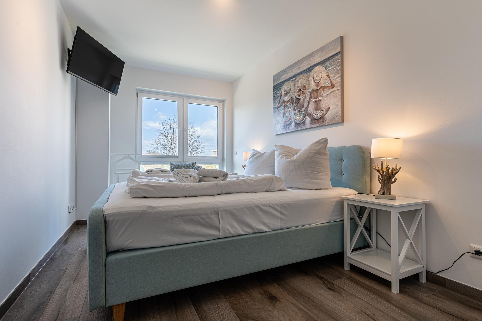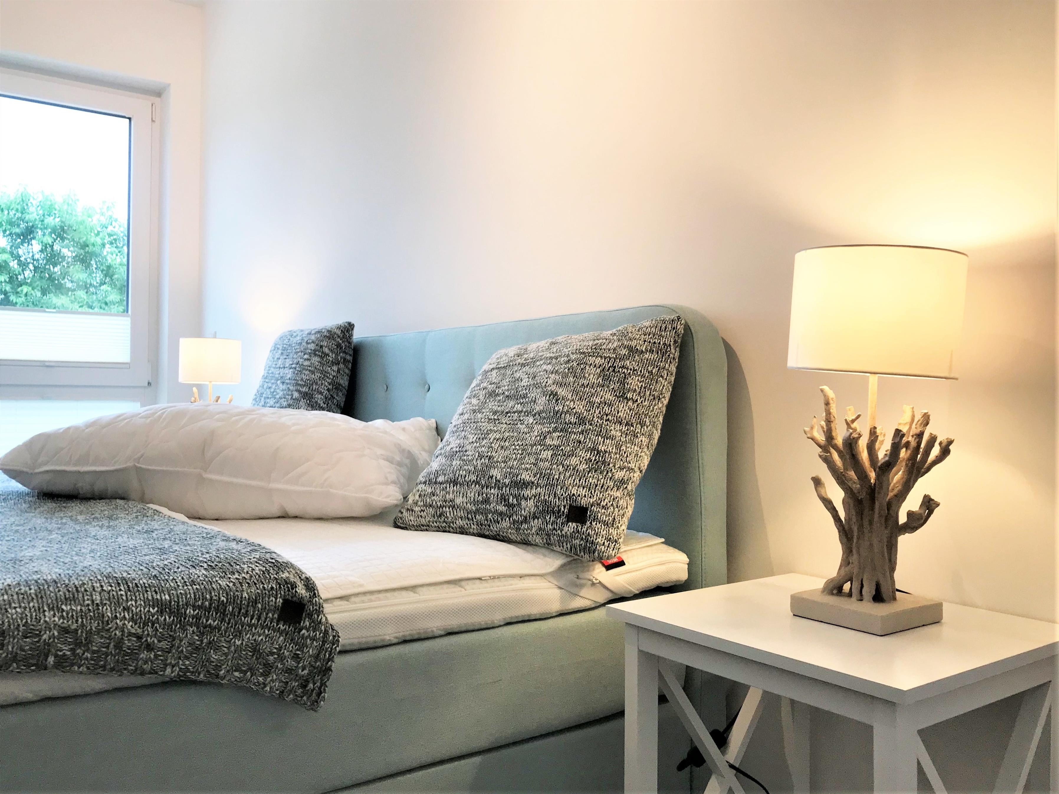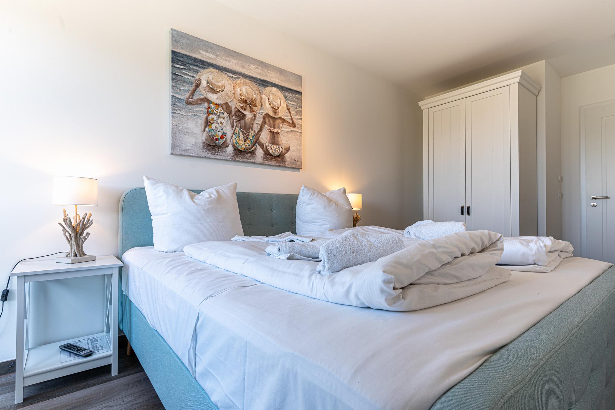 Die beiden komfortablen Schlafzimmer sorgen mit jeweils einem hochwertigen Boxspringbett 1,80x2,00m, durchgängige Topper) für einen erholsamen Schlaf im Urlaub. Ferner erwartet Sie im ersten Schlafzimmer ein separater Ankleideraum für Ihre mitgebrachte Urlaubsgarderobe. Das zweite Schlafzimmer bietet Ihnen einen geräumigen Kleiderschrank. Beide Schlafzimmer sind zusätzlich mit einem weiteren Flatscreen-TV ausgestattet.