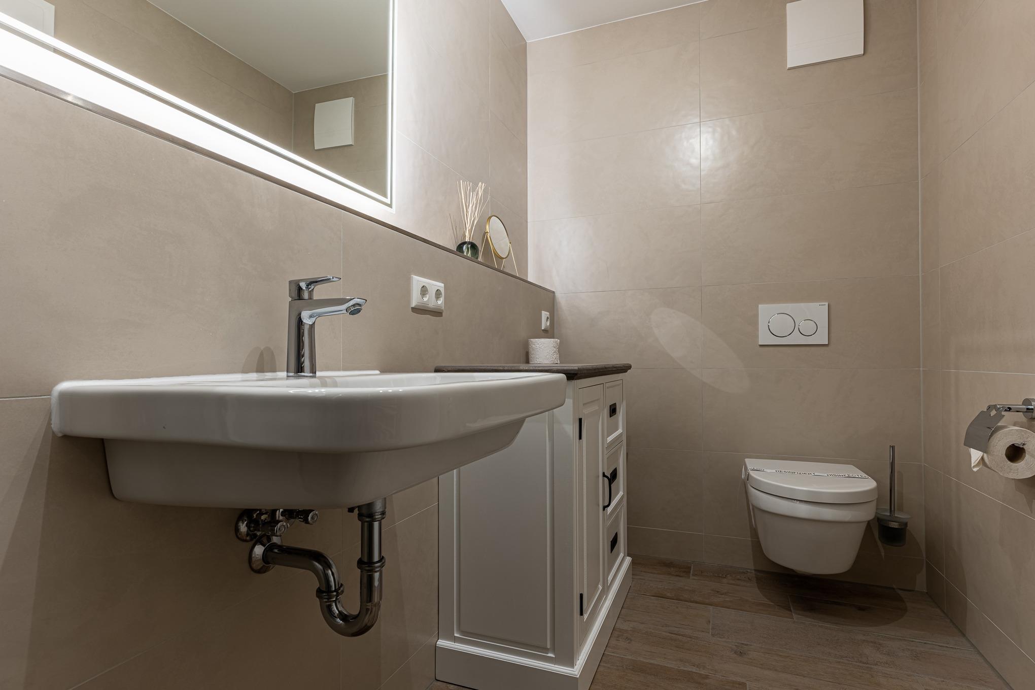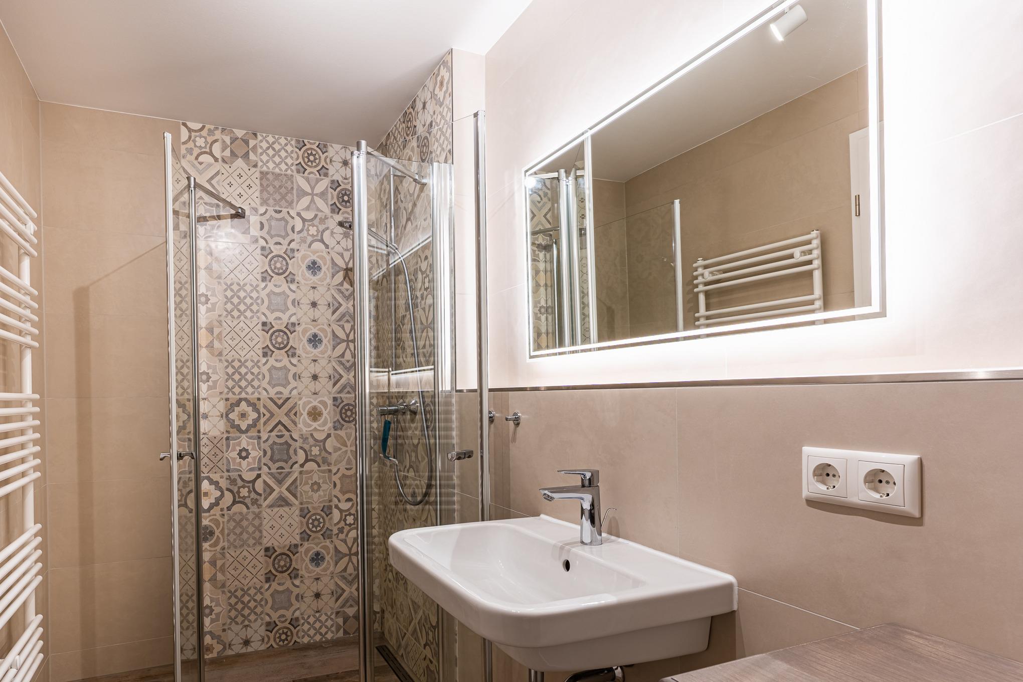 Das stimmungsvolle Badezimmer verfügt über eine ebenerdige Dusche, WC sowie einem modernem Waschtisch mit großem, beleuchtetem Spiegel. Ein Reisefön ist vorhanden.