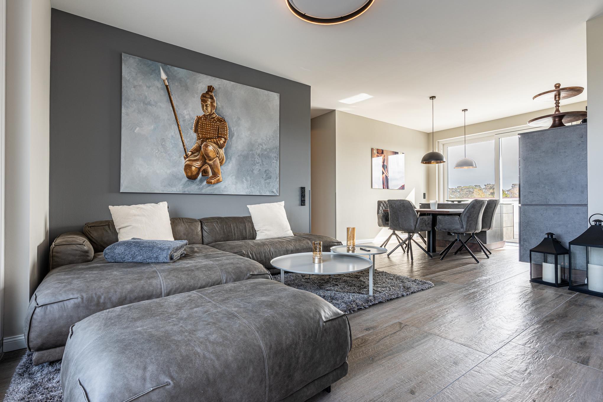 Der großzügige, kombinierte Wohnbereich bietet Ihnen viel Platz, ein bequemes Sofa zum Entspannen und sorgt mit Smart-TV und Bose-Soundsystem für genügend Entertainment während Ihres Aufenthaltes. Das Mobiliar ist in diesem Raum so integriert, dass ein zweiter Schlafbereich mit einem gemütlichen Doppeltbett (1,60x2,00m durchgängiger Topper) geschaffen wurde.