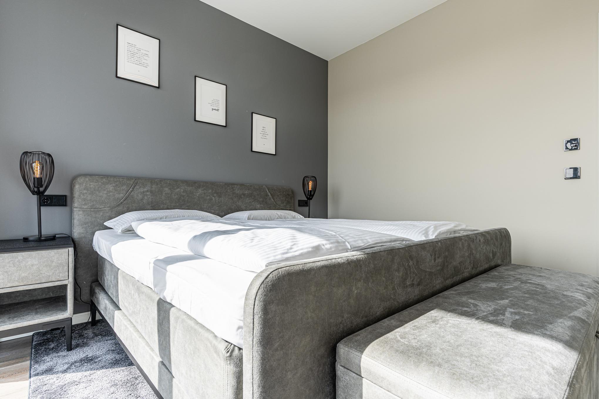 Das stilvolle Schlafzimmer bietet Ihnen ein bequemes Doppeltbett in den Maßen 1,80x200cm (durchgängiger Topper) sowie einen begehbaren Kleiderschrank mit viel Platz für die Urlaubsgarderobe.