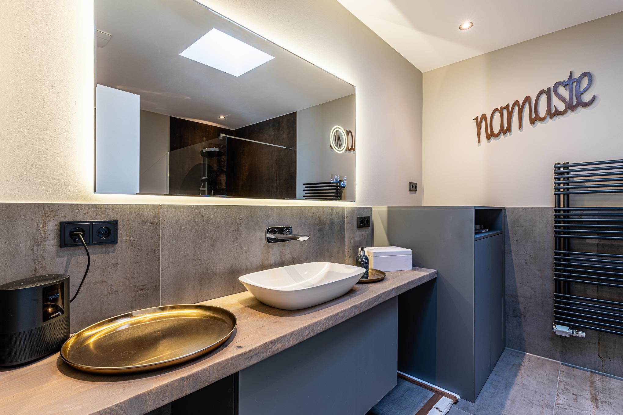 Das moderne Badezimmer (Tageslichtbad) ist nebst ebenerdiger Regendusche mit einer freistehenden Wanne und einem großen Waschtisch mit genügend Ablagemöglichkeiten für Ihre Kosmetikartikel ausgestattet. Ferner steht Ihnen hier ein kombinierter Waschtrockner zur Verfügung.