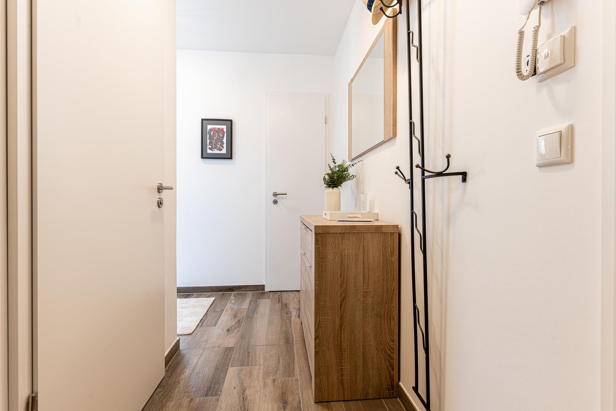 Das komfortabel eingerichtete App. 28 befindet sich in der 1. Etage des Hauses und bietet Ihnen auf 57qm alles, was man für einen erholsamen Urlaub braucht. Alle Räumlichkeiten sind mit hochwertigem Mobiliar sowie einer Fußbodenheizung und Außenjalousien zum Schutz vor Licht und Hitze ausgestattet.