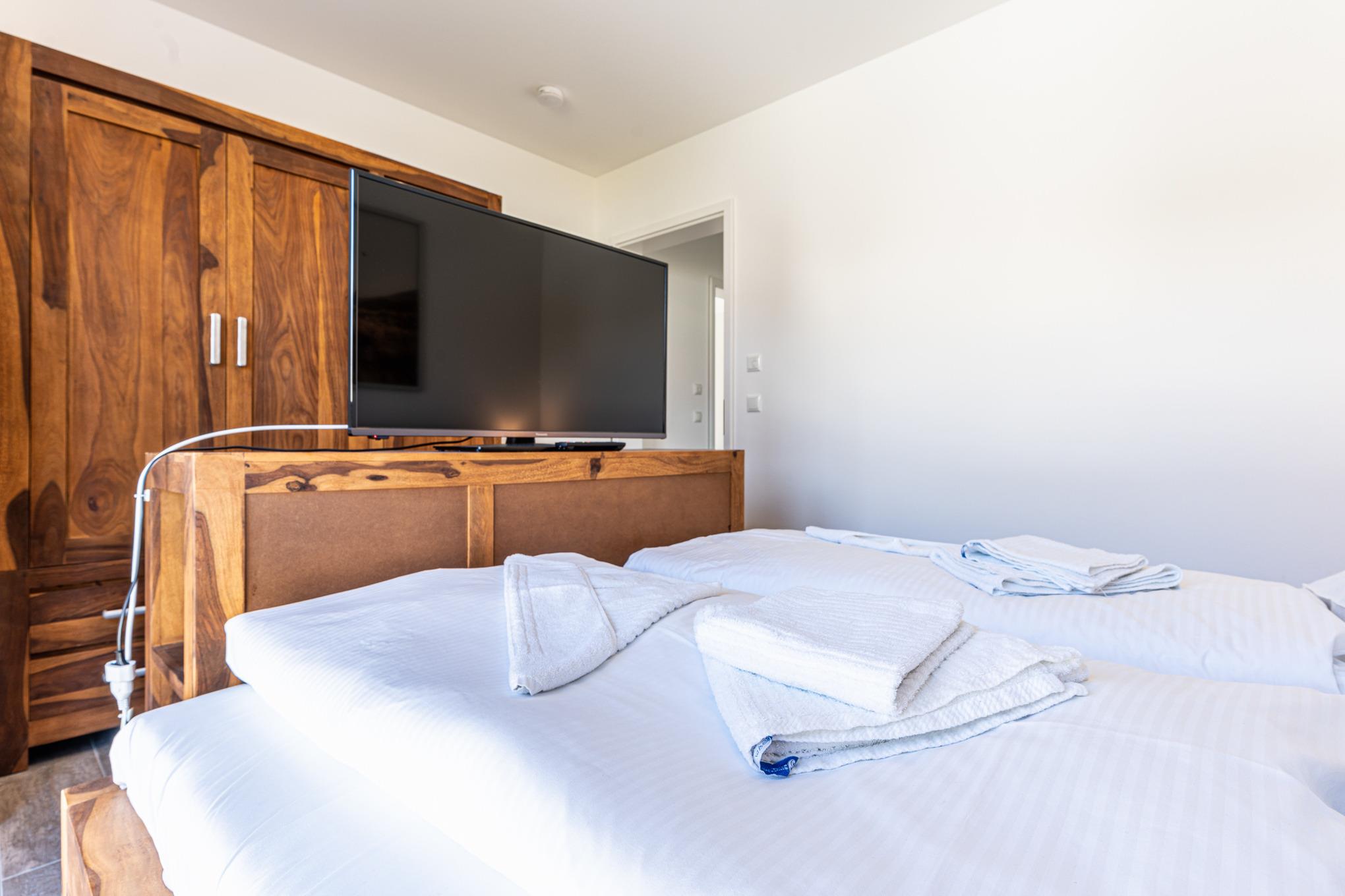 Das separate Schlafzimmer sorgt mit einem gemütlichen Doppelbett (1,80x2,00m, 2 Einzelmatratzen) für erholsamen Schlaf und süße Träume. Für die mitgebrachte Urlaubsgarderobe steht Ihnen natürlich ein geräumiger Kleiderschrank zur Verfügung, ein weiterer Flatscreen rundet die Ausstattung ab.