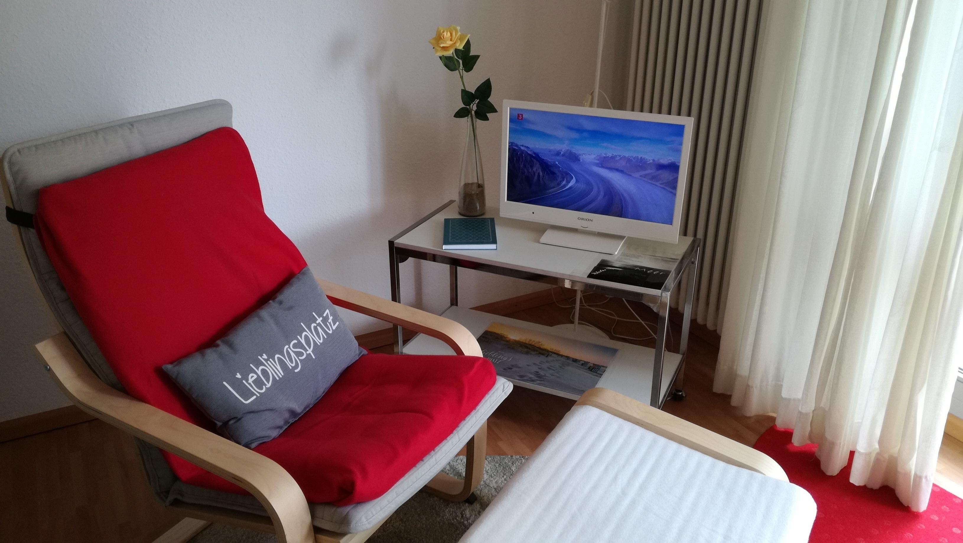 Ruhige Ferienwohnung mit Balkon zur Westseite. Sie können nachmittags die Sonne genießen, mit Blick ins Grüne und seitlichem Meerblick.