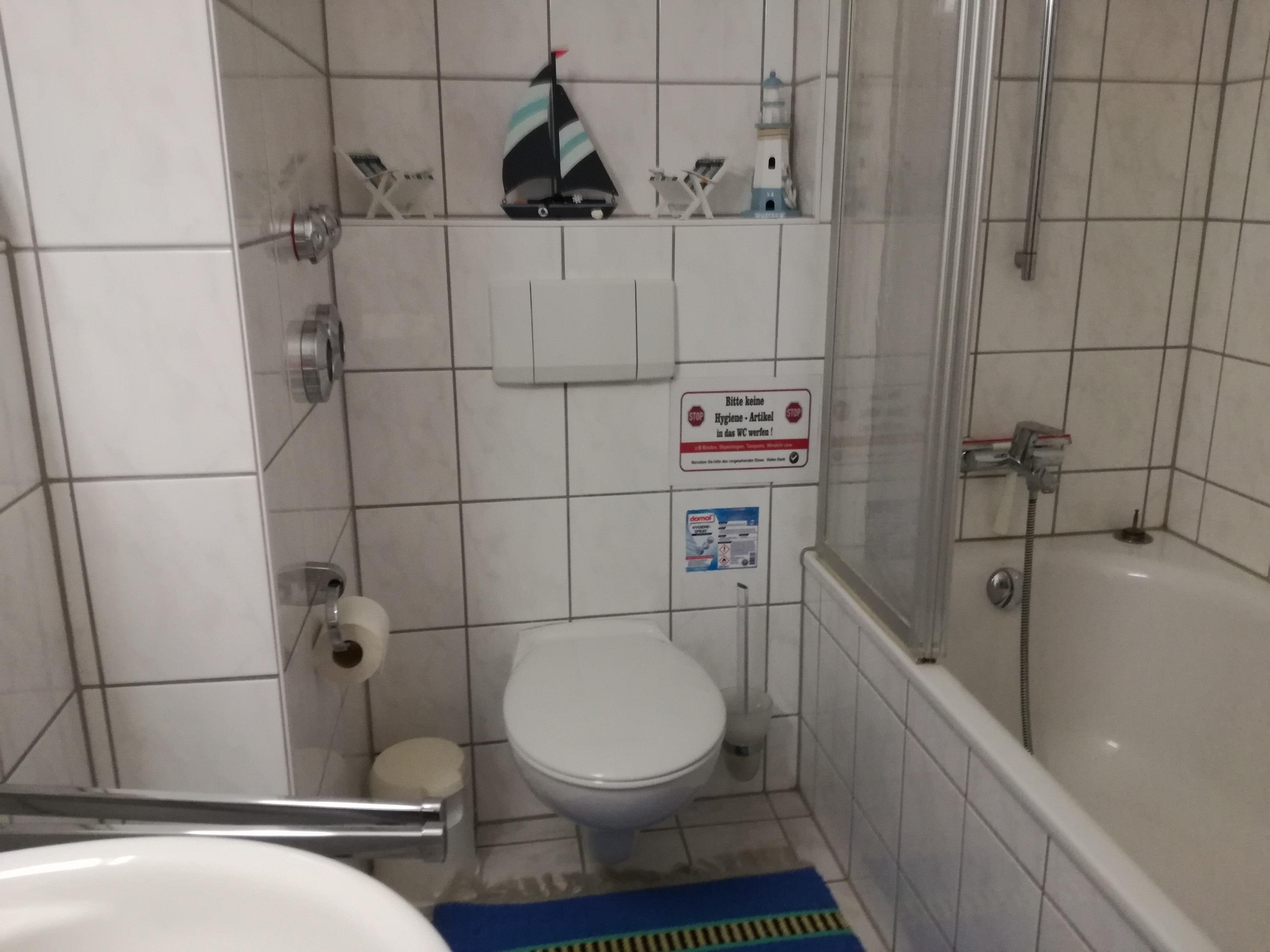 Das Badezimmer verfügt über eine Badewanne, WC sowie einem Waschtisch mit beleuchteten Spiegel.