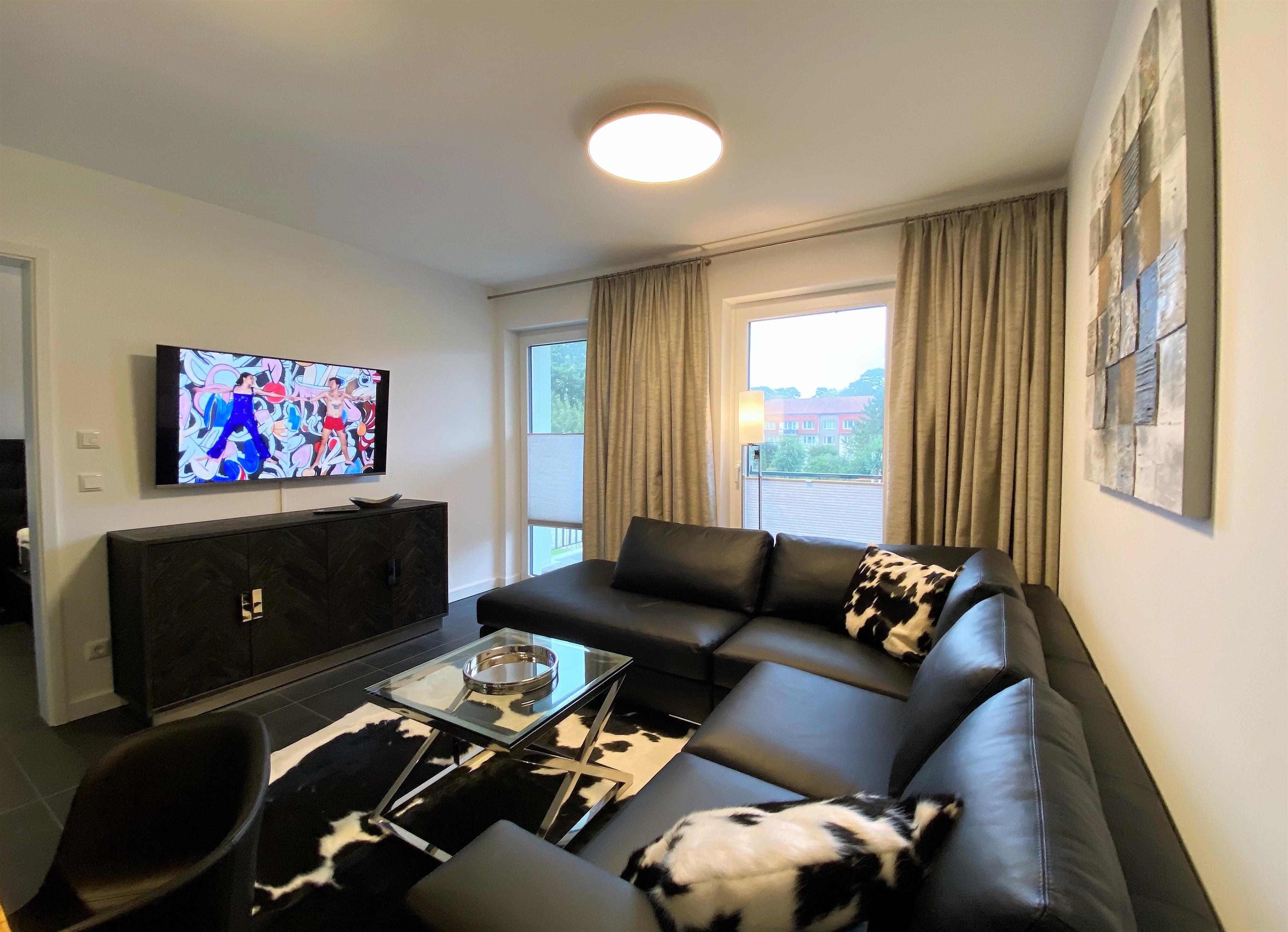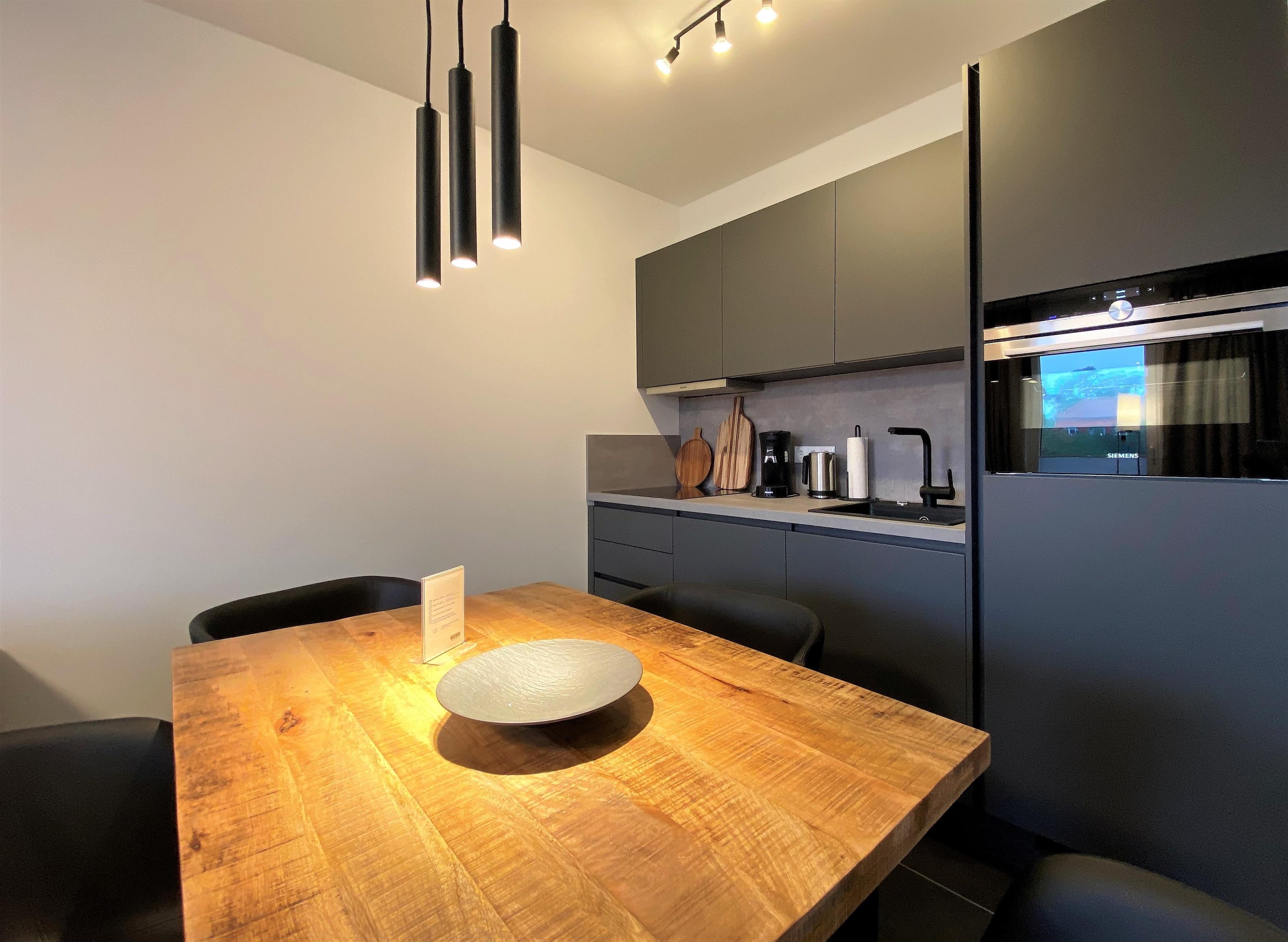 Das kombinierte Wohn/Esszimmer mit offener Küche punktet durch seine elegante Einrichtung. Der Wohnbereich ist mit einer hochwertigen Ledercouch, elegantem Mobiliar sowie einem großen Flatscreen-TV ausgestattet. An dem großen Esstisch findet sich genügend Platz für ein gemütliches Frühstück oder ein stimmungsvolles Abendessen.