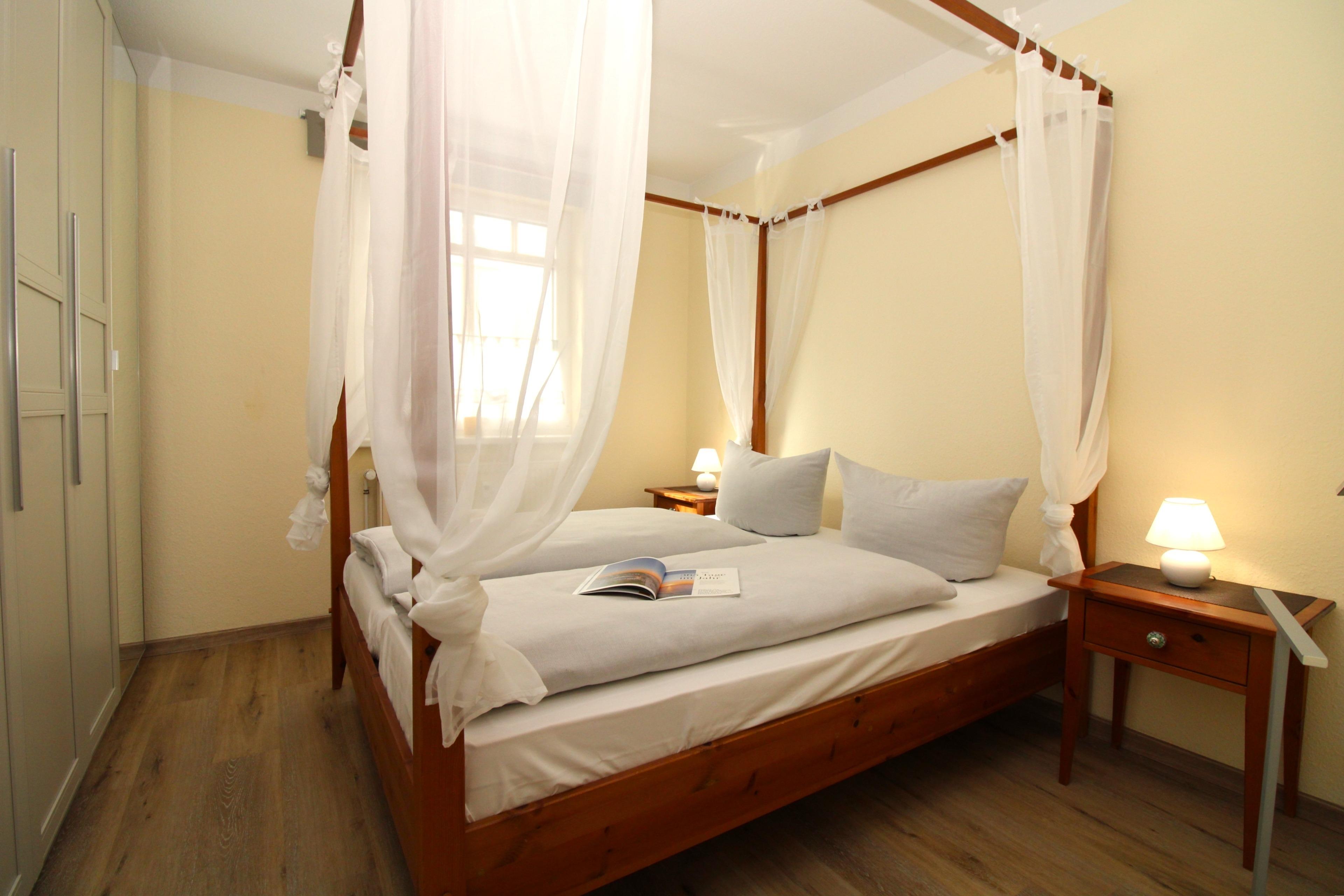 Das gemütliche Schlafzimmer ist mit einem bequemen Doppelbett (2 x 80 cm x 200 cm), Nachttischen mit Nachttischlampen, einem geräumigen Kleiderschrank, einem Kleiderständer sowie einem Stuhl eingerichtet.