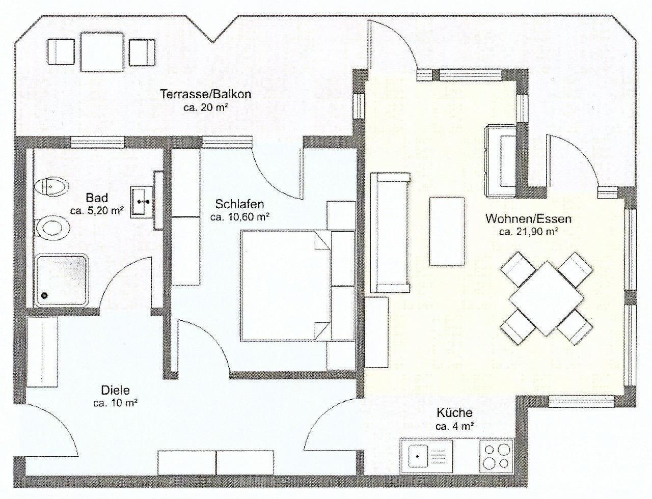 Mit dem umlaufenden Süd- und Ostbalkon können Sie das Meer und die Sonne bis zum Sonnenuntergang und das wohltuende Meeresklima der Ostsee genießen. Vom Wohnzimmer aus haben Sie über zwei Türen Zugang zum Balkon, welcher über Eck eingefasst ist. Über eine weitere Tür ist der Balkon auch vom Schlafzimmer begehbar. Hier befinden sich mehrere Sitzgelegenheiten für Sie zur Nutzung.