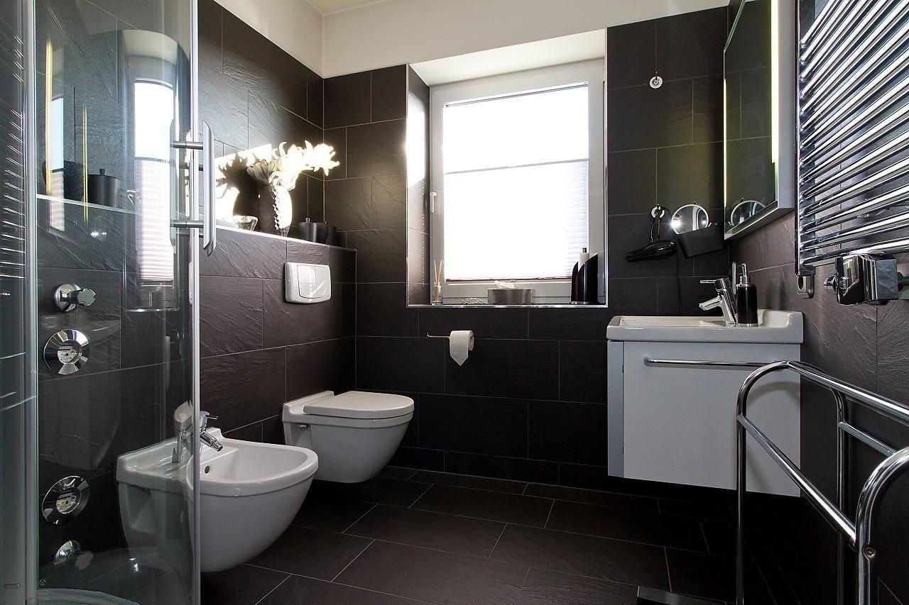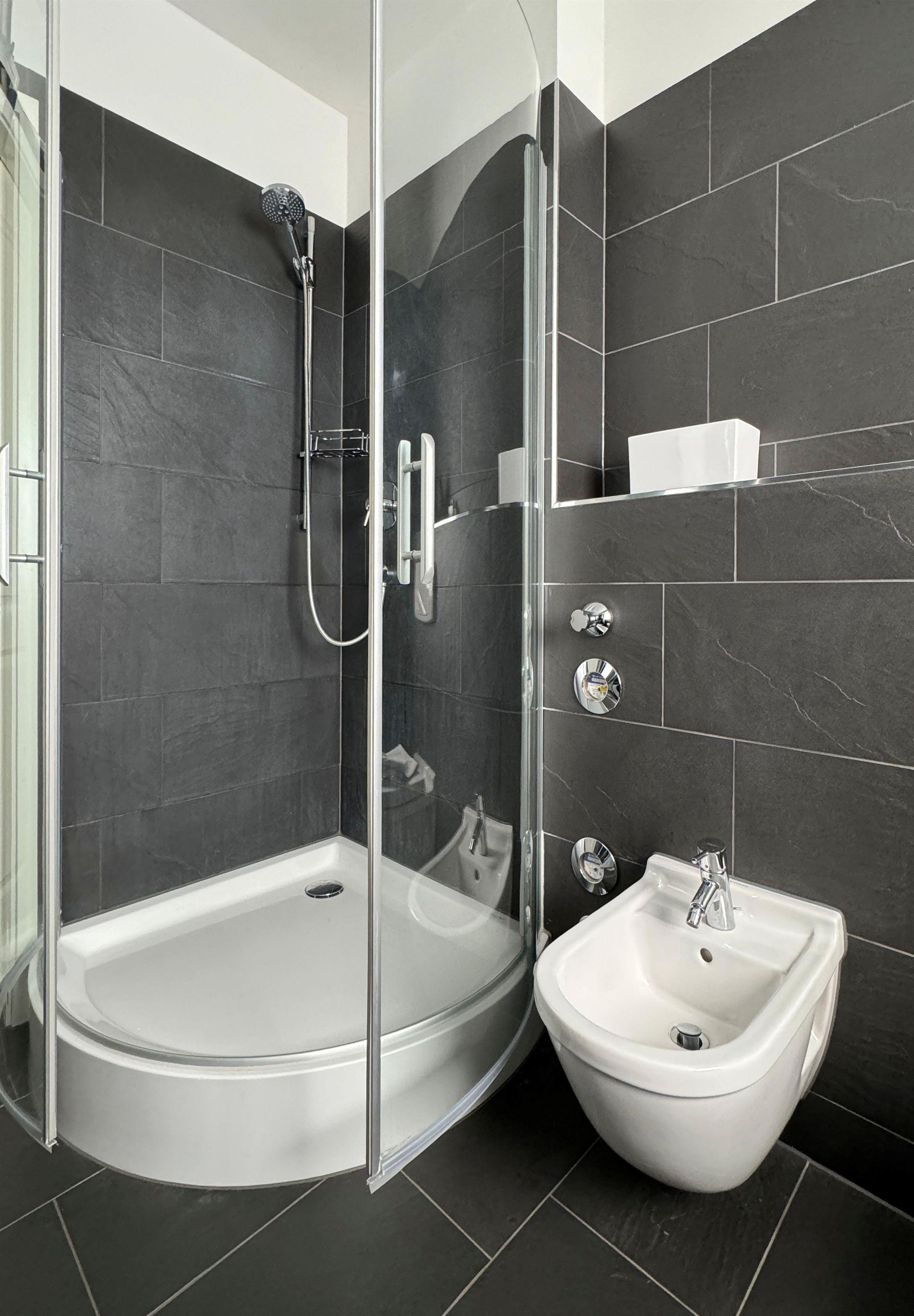 Das exklusive Badezimmer besitzt eine schöne Runddusche mit Regenbrause, ein Bidet und einen Waschtisch mit großem Spiegel. Es ist außerdem mit Fön, Kosmetikspiegel, Personenwaage und einem Handtuchwärmer ausgestattet.