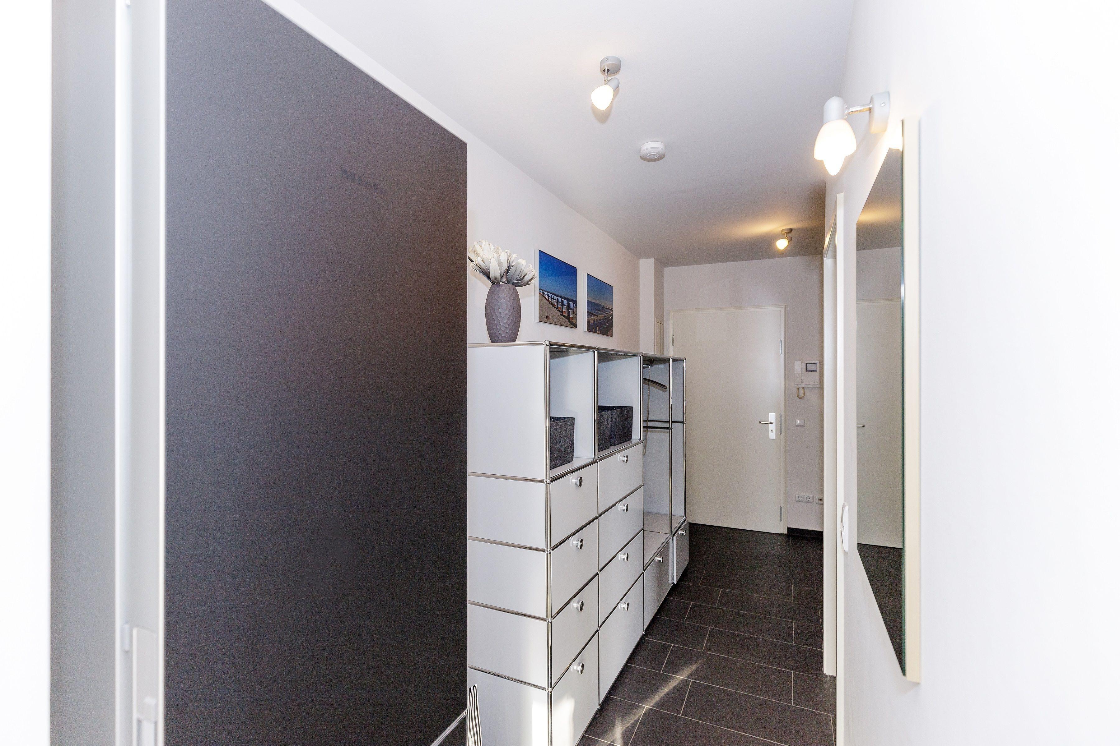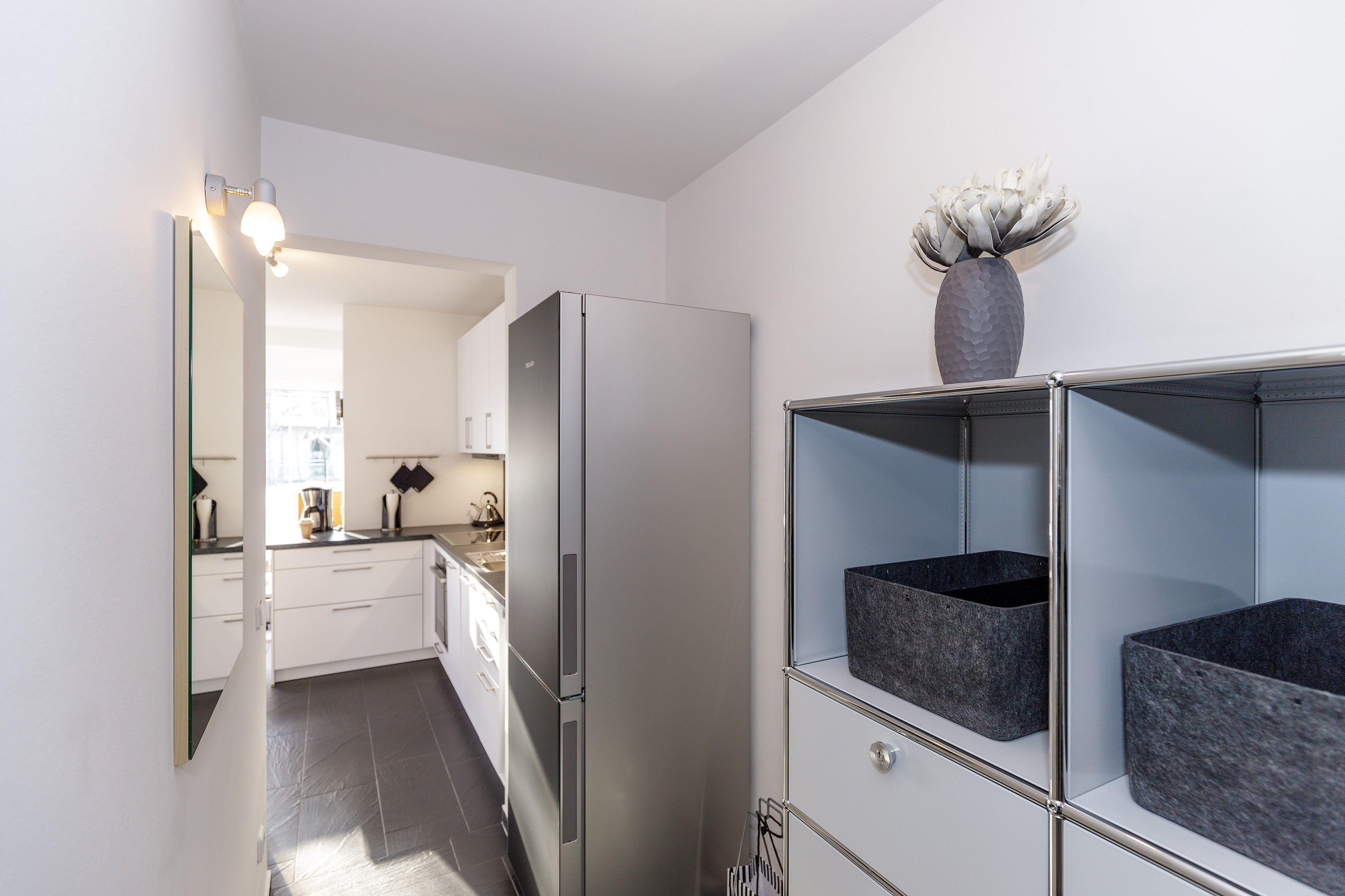 Zusätzlicher Stauraum steht Ihnen in einem USM-Garderobenregal im Flur zur Verfügung. Hier befindet sich auch einen Besenschrank mit den wichtigsten Putzutensilien.