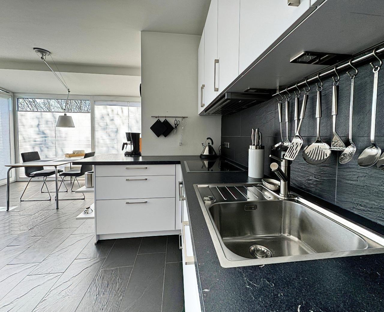 Die voll ausgestattete Küchenzeile grenzt an den Wohnbereich und bietet Ihnen auch im Urlaub alles was Sie benötigen. Hier finden Sie: Ceranfeld mit Dunstabzugshaube, Geschirrspüler, Backofen, eine großzügige Kühl-/Gefrierkombination, Wasserkocher, Toaster, Kaffeemaschine und natürlich genügend Geschirr und Besteck.