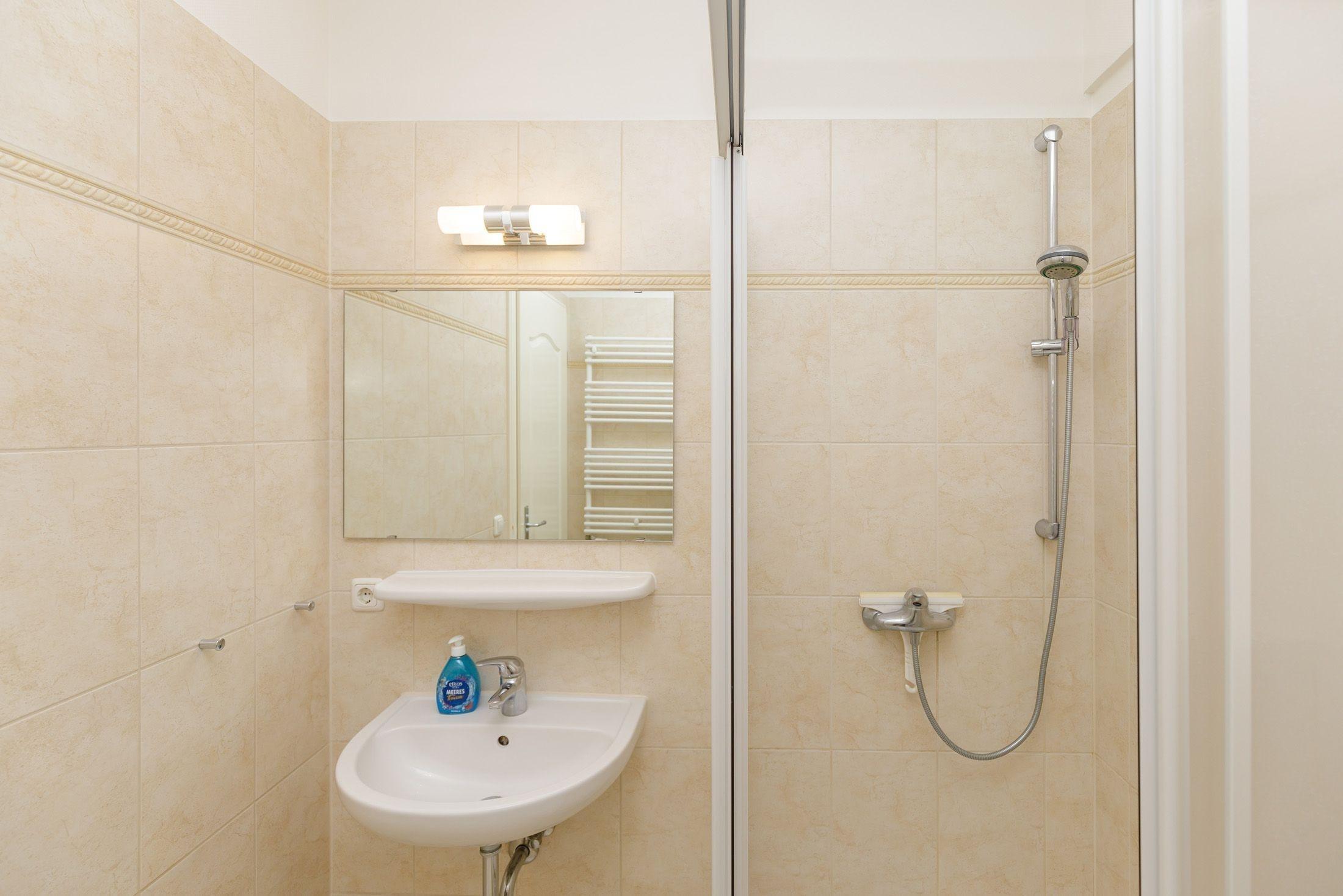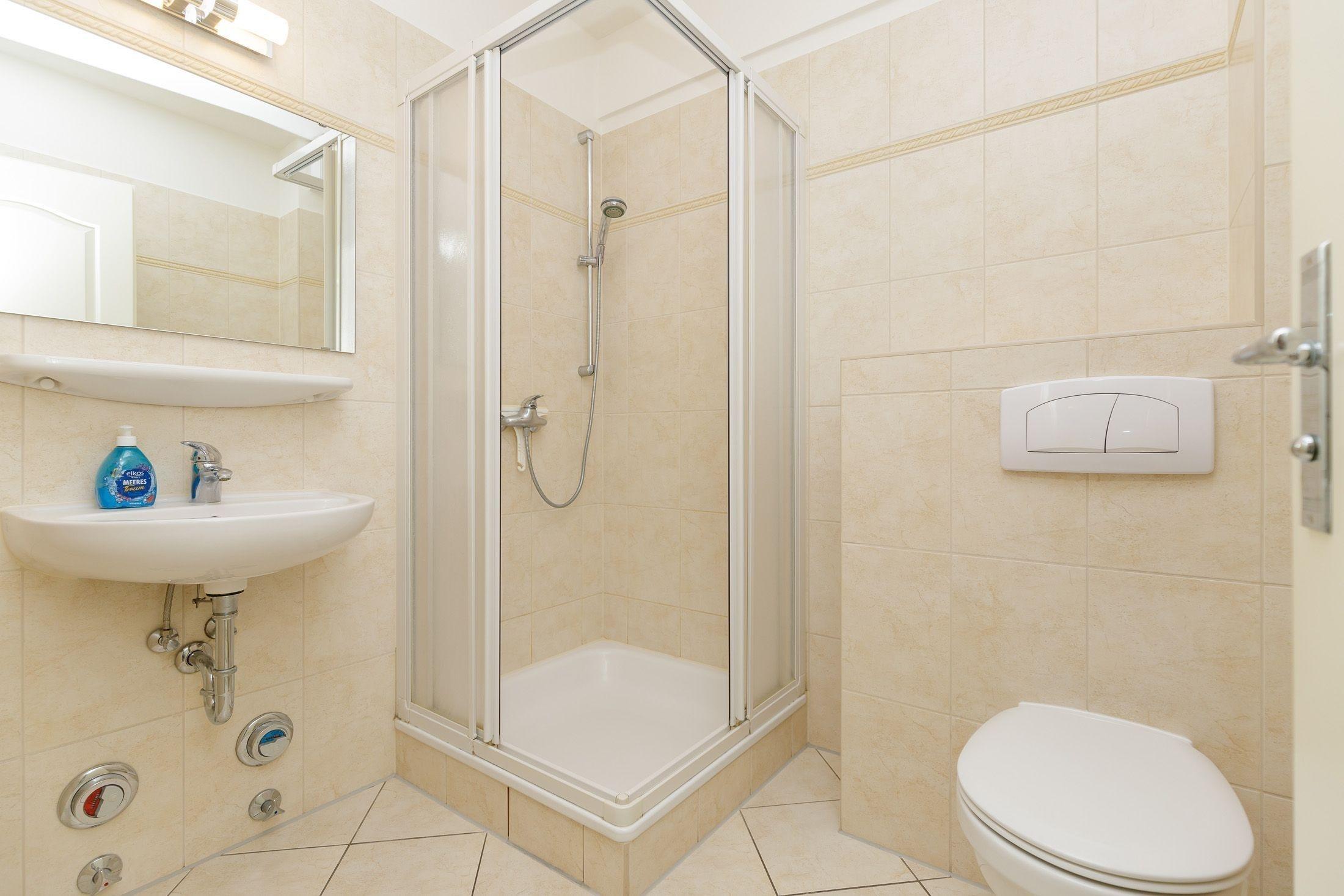 Das Bad mit Dusche und WC ergänzt die geschmackvoll eingerichtete Wohnung.
