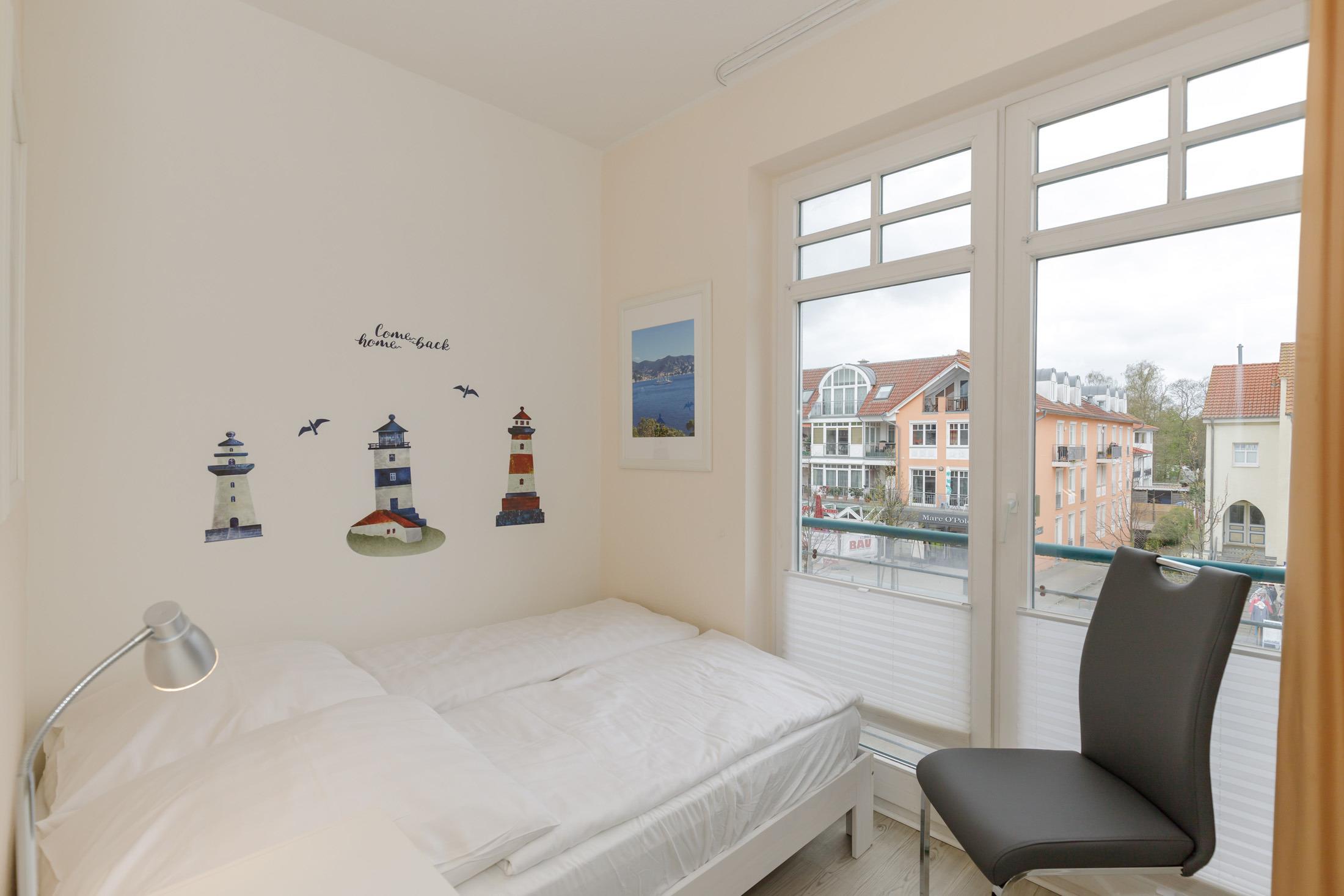 Das separate und zusätzliche 2. Schlafzimmer verfügt ebenfalls über große bodentiefe Fenster (französischer Balkon), ein bequemes französisches Doppelbett (140 cm x 200 cm), einen Kleiderschrank sowie einen kleinen Tisch mit Stuhl. Für einen guten Schlafkomfort verfügen beide Schlafzimmer über Verdunkelungsvorhänge bzw. Jalousien.