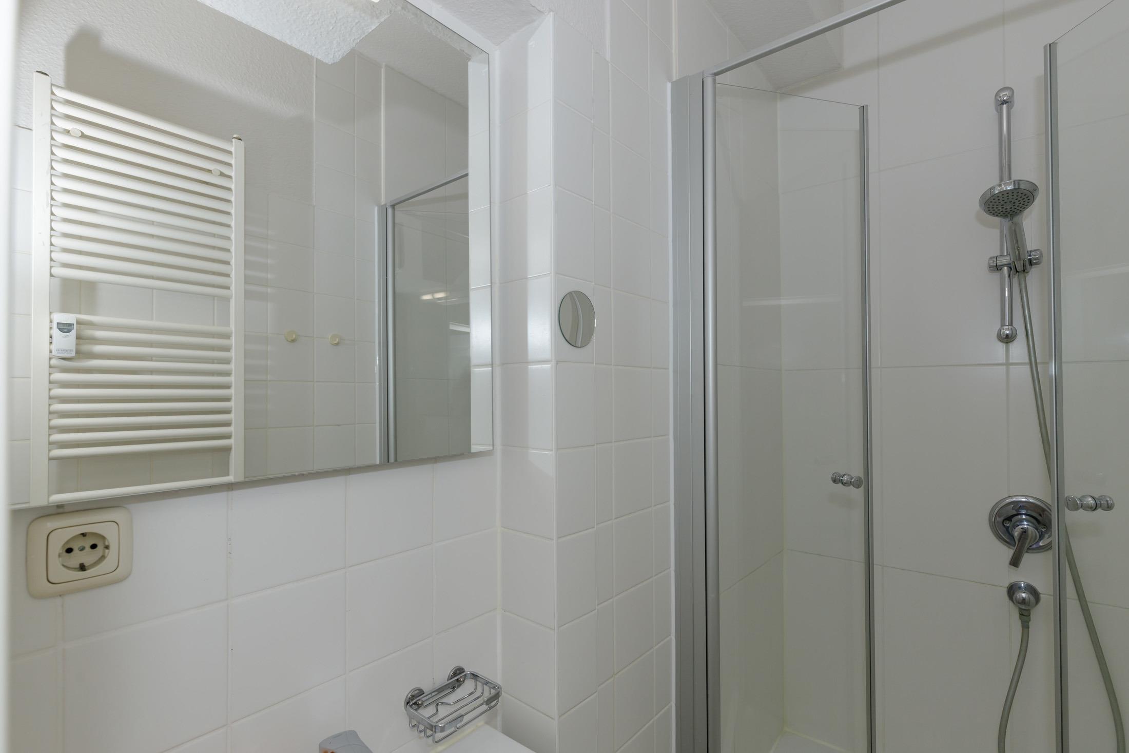 Das Badezimmer verfügt über eine Dusche mit Echtglas-Duschabtrennung, Waschbecken mit Unterschrank sowie einen Handtuch-Heizkörper. In einem separaten Raum befindet sich das WC mit Waschbecken und Unterschrank.