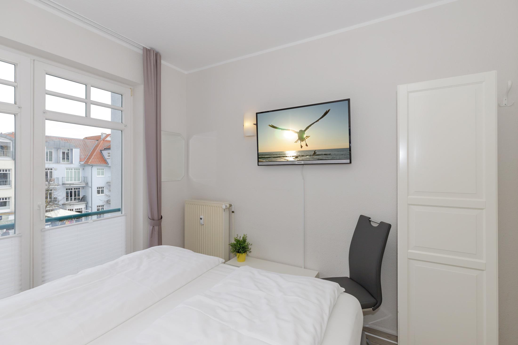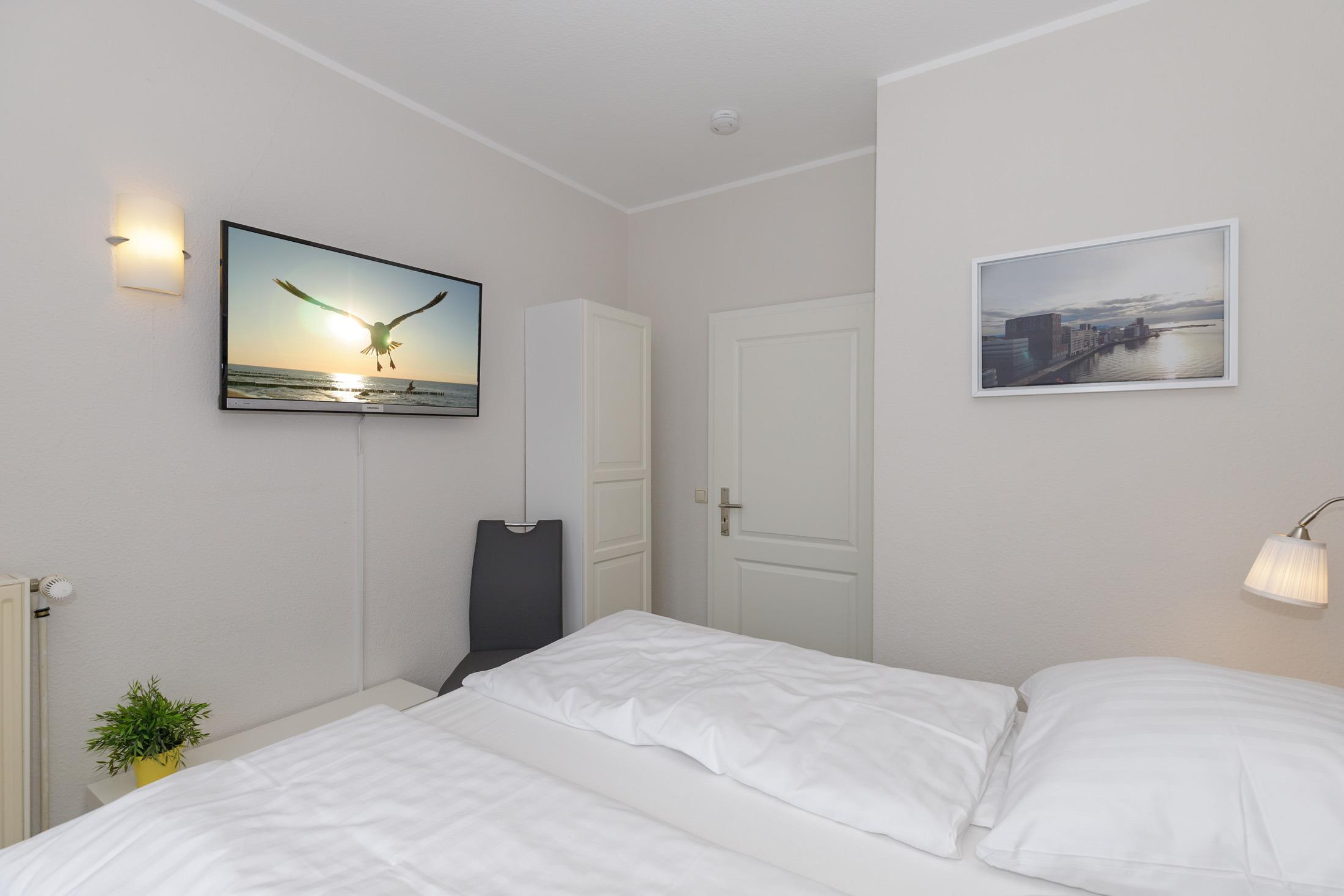 Das freundliche und helle 1. Schlafzimmer mit großen bodentiefen Fenstern (französischer Balkon) ist mit einem bequemen Boxspring-Doppelbett (180 cm x 200 cm), Nachttischen mit Nachttischlampen sowie einem Kleiderschrank eingerichtet. Darüber hinaus steht Ihnen hier ein weiteres TV-Gerät zur Verfügung.
