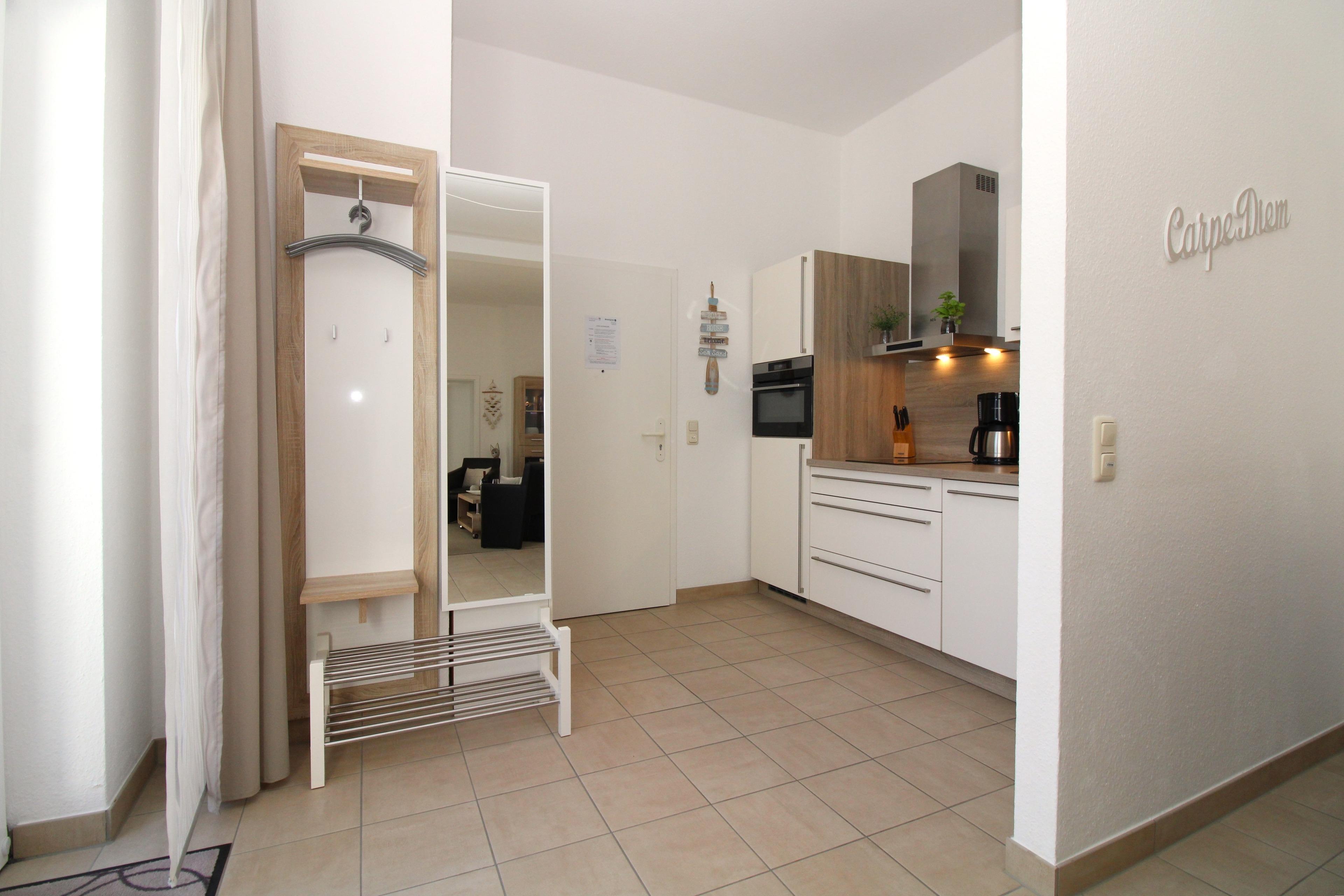 Ihre Jacken und Schuhe können Sie an der großen Garderobe (mit Spiegel) und Schuhablage im Eingangsbereich der Wohnung unterbringen. Weiterhin steht Ihnen hier noch ein geräumiger Schrank (u.a. mit Reinigungszubehör) zur Verfügung.