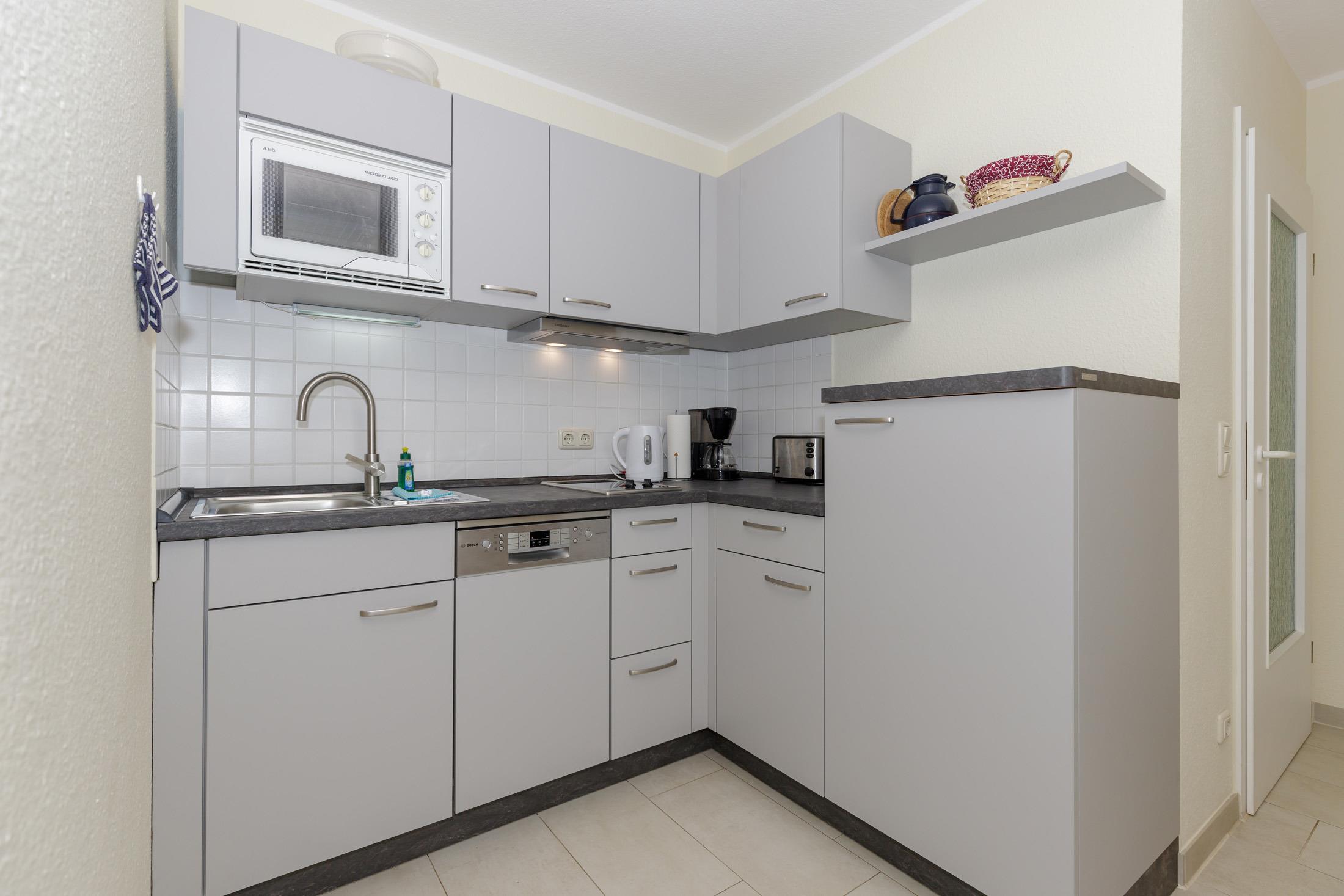 Die moderne offene Küche beinhaltet eine voll ausgestattete Einbauküchenzeile mit 2-Zonen-Induktions-Ceran-Kochfeld, Dunstabzug, Mikrowelle, Kühlschrank mit Gefrierfach, Geschirrspülmaschine, Kaffeemaschine, Wasserkocher und Toaster. Auf Wunsch stellen wir Ihnen auch gerne einen portablen Backofen zur Verfügung. Die Küche ist mit Geschirr, Gläsern, Besteck und Töpfen komplett ausgestattet.