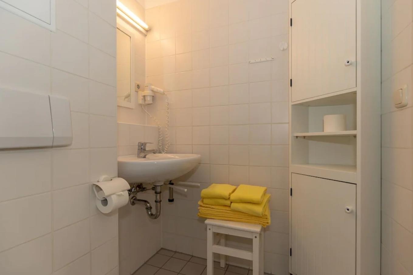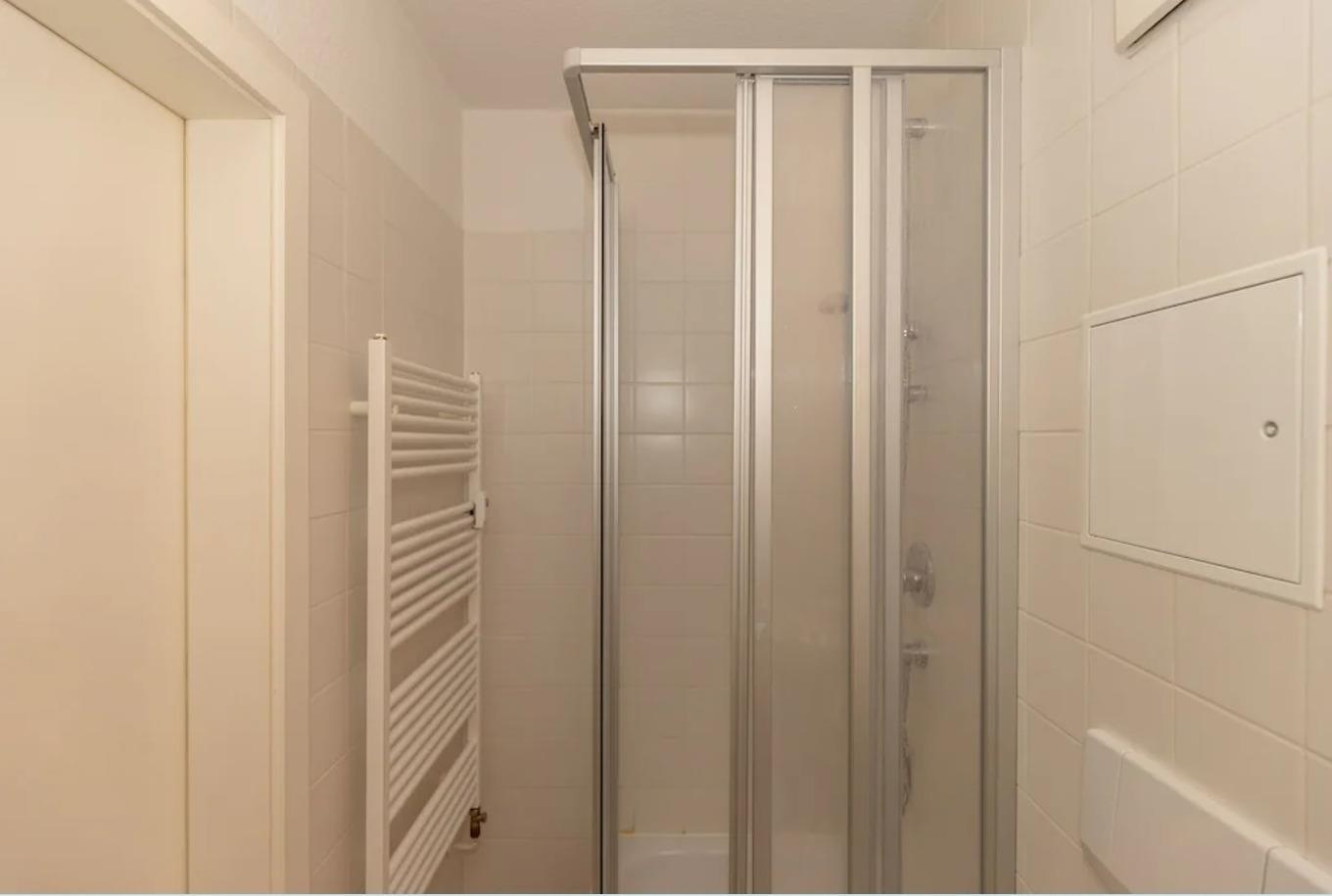 Das Badezimmer verfügt über eine Dusche, Waschbecken und WC, einen Badezimmerschrank, einen Hocker, einen Handtuch-Heizkörper sowie ausreichend Ablagemöglichkeiten.