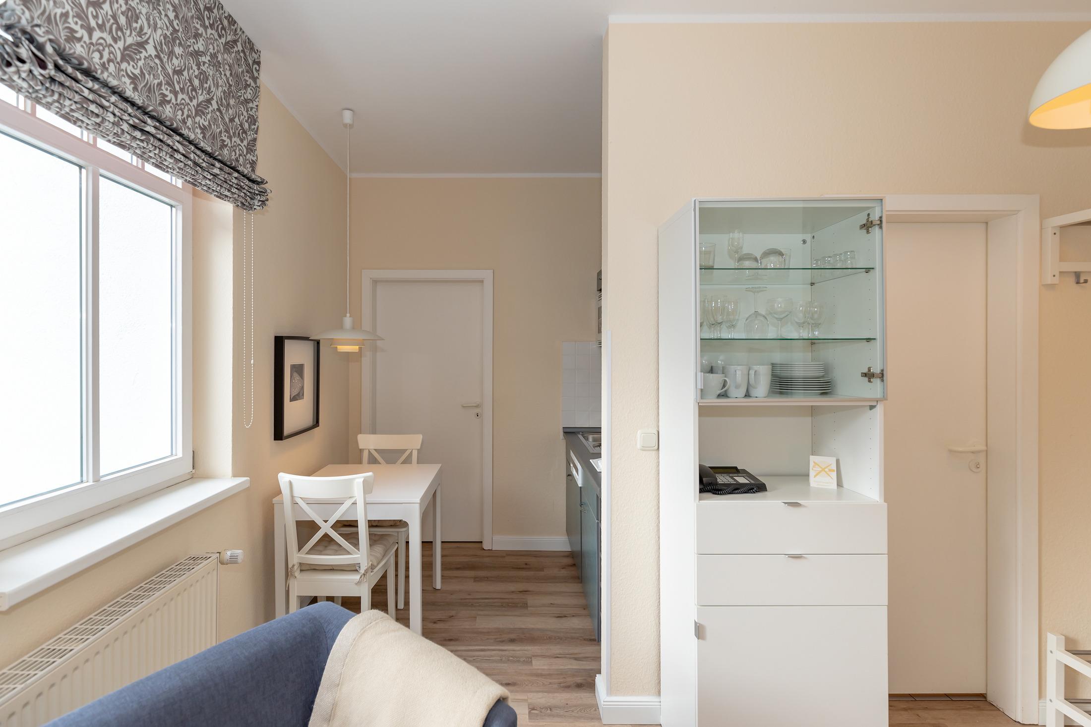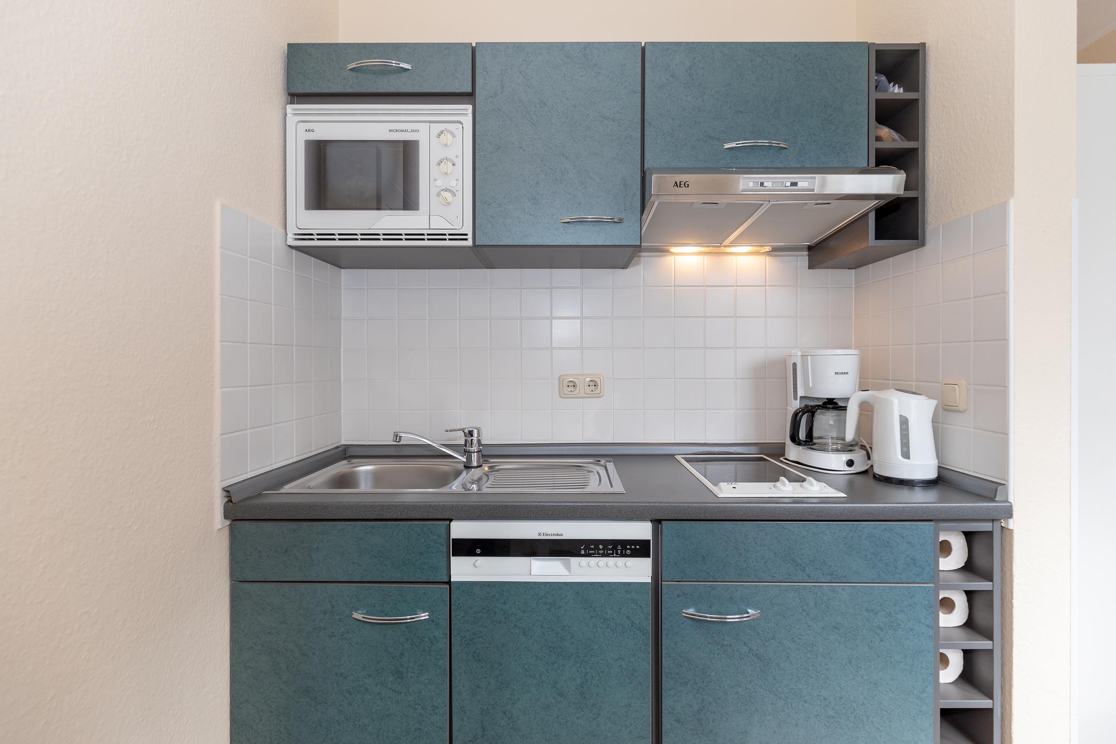 Die offene Küche beinhaltet eine voll ausgestattete Einbauküchenzeile mit 2-Zonen-Ceran-Kochfeld, Dunstabzug, Mikrowelle, Kühlschrank mit Gefrierfach, Geschirrspülmaschine, Kaffeemaschine, Wasserkocher und Toaster. Auf Wunsch stellen wir Ihnen auch gerne einen portablen Backofen zur Verfügung. Die Küche ist mit Geschirr, Gläsern, Besteck und Töpfen komplett ausgestattet.