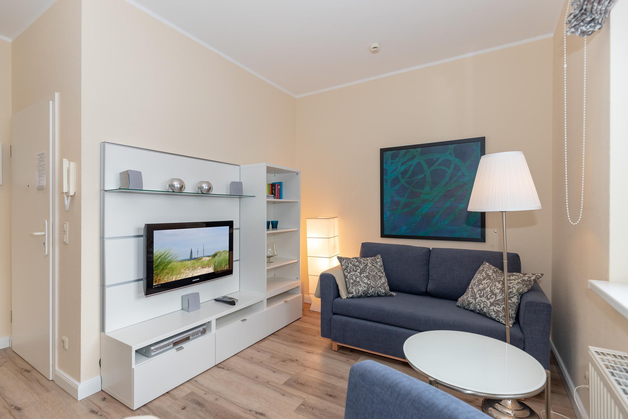 Das strandnahe, moderne und helle 2-Zimmer-Appartement 223 (ca. 30 m²) im 1. Obergeschoss im Haus B (ohne Fahrstuhl) besitzt ein hohes Maß an Wohlfühlkomfort und ist komplett eingerichtet. Der Bodenbelag im gesamten Wohnbereich ist hochwertiger Vinyl-Designbelag in edler Holzoptik, das Bad / WC ist gefliest.