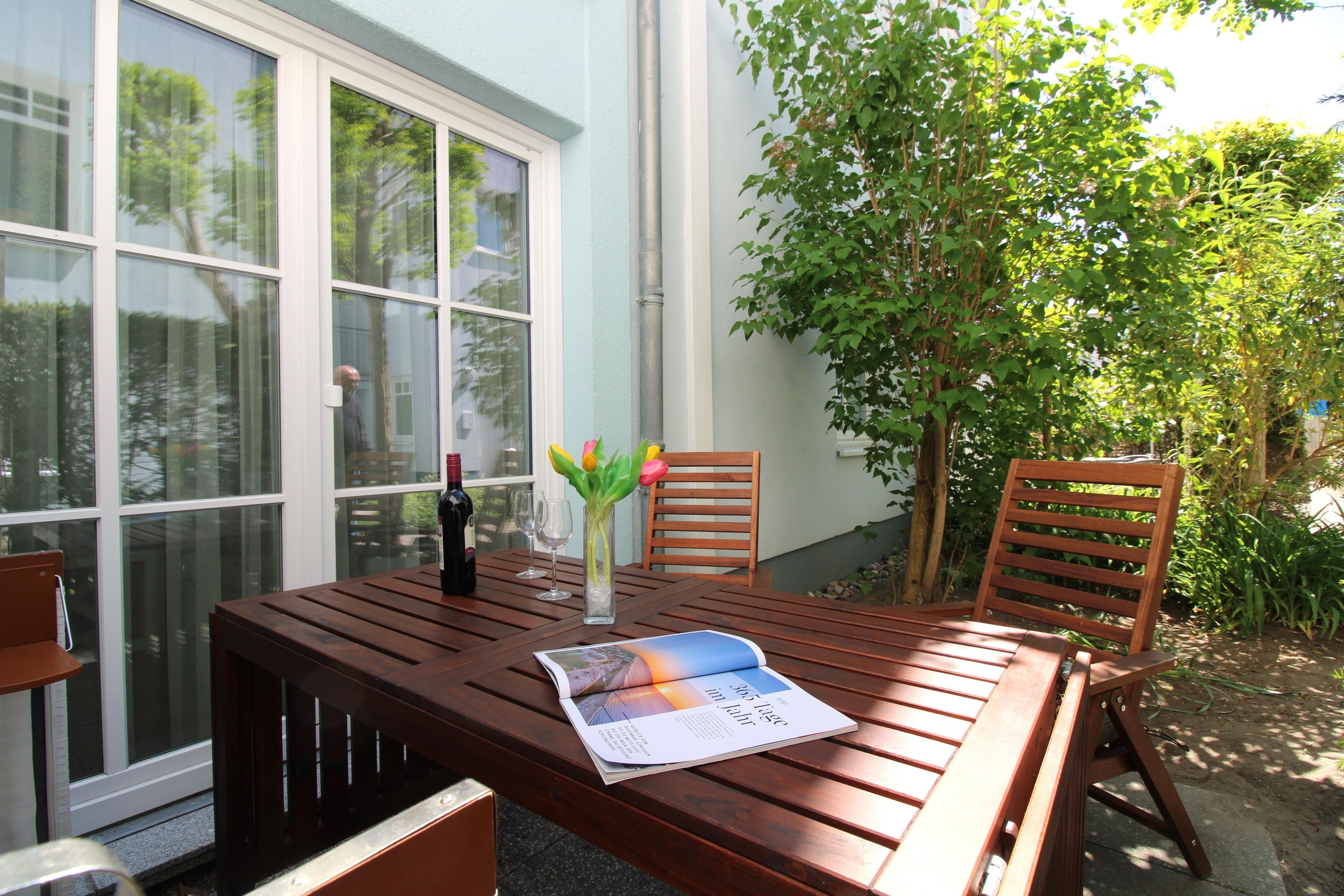 Der freundliche und gemütliche Wohn-/Essbereich verfügt über eine separate Sitzgruppe mit bequemer (ausziehbarer Schlaf-)Couch, 2 bequeme Korbsessel mit Couchtisch, einen separaten Esstisch mit Stühlen sowie eine Glasvitrine. Vom Wohnbereich aus haben Sie direkten Zugang zu der ca. 4 m² großen Terrasse (im Innenhof nach Süd-Westen ausgerichtet) mit einem gemütlichen Strandkorb und bequemen Terrassenmöbeln. Hier sitzen Sie entspannt und gemütlich im Grünen und können abends bei einem guten Glas Wein in Ruhe die lauen Sommernächte genießen!