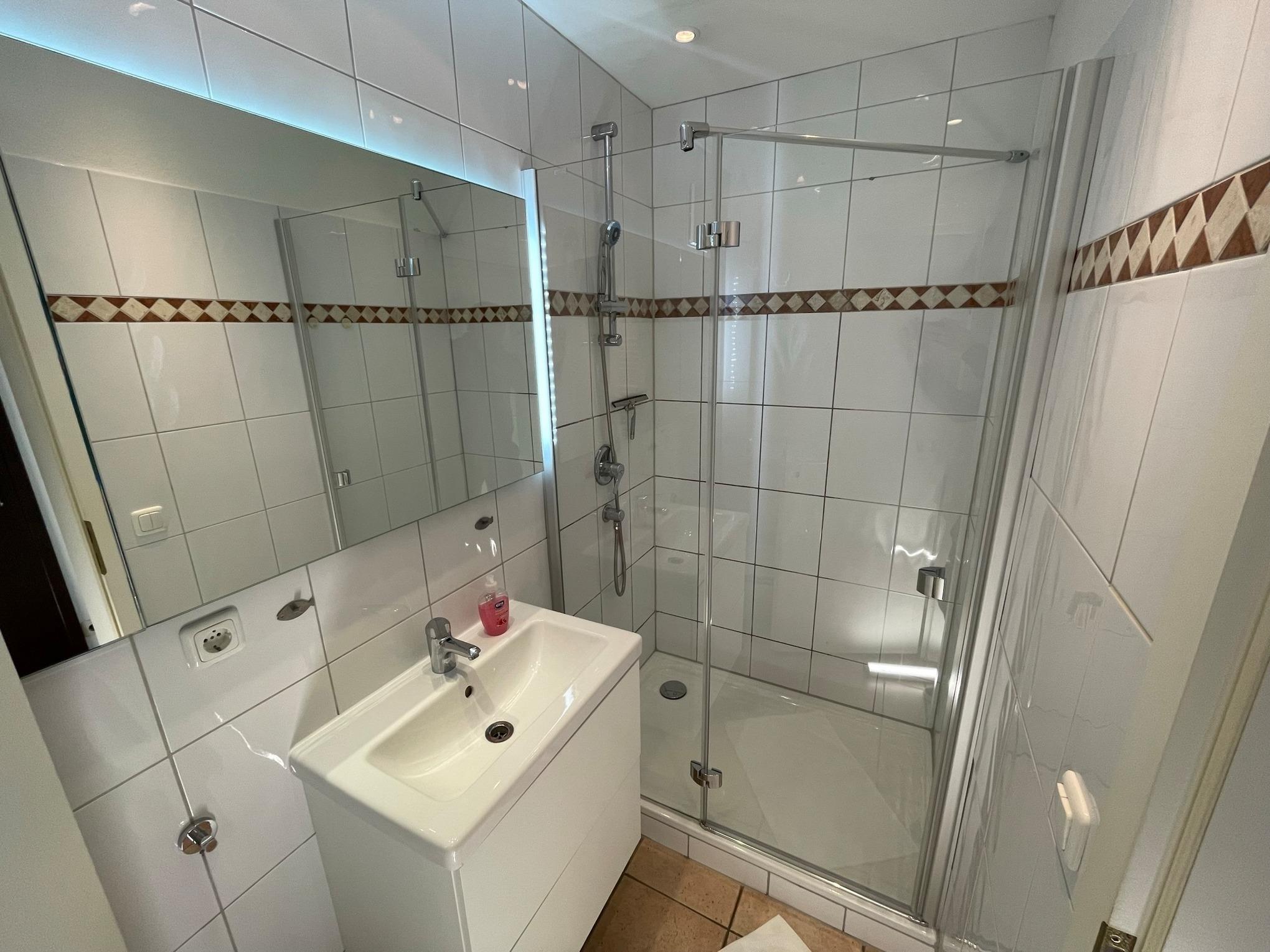 Das moderne Badezimmer verfügt über eine Echtglas-Dusche mit niedrigem und seniorengerechtem Einstieg, Waschbecken mit Unterschrank und großem Spiegelschrank, WC, Handtuch-Heizkörper, Föhn sowie ausreichend Ablagemöglichkeiten.