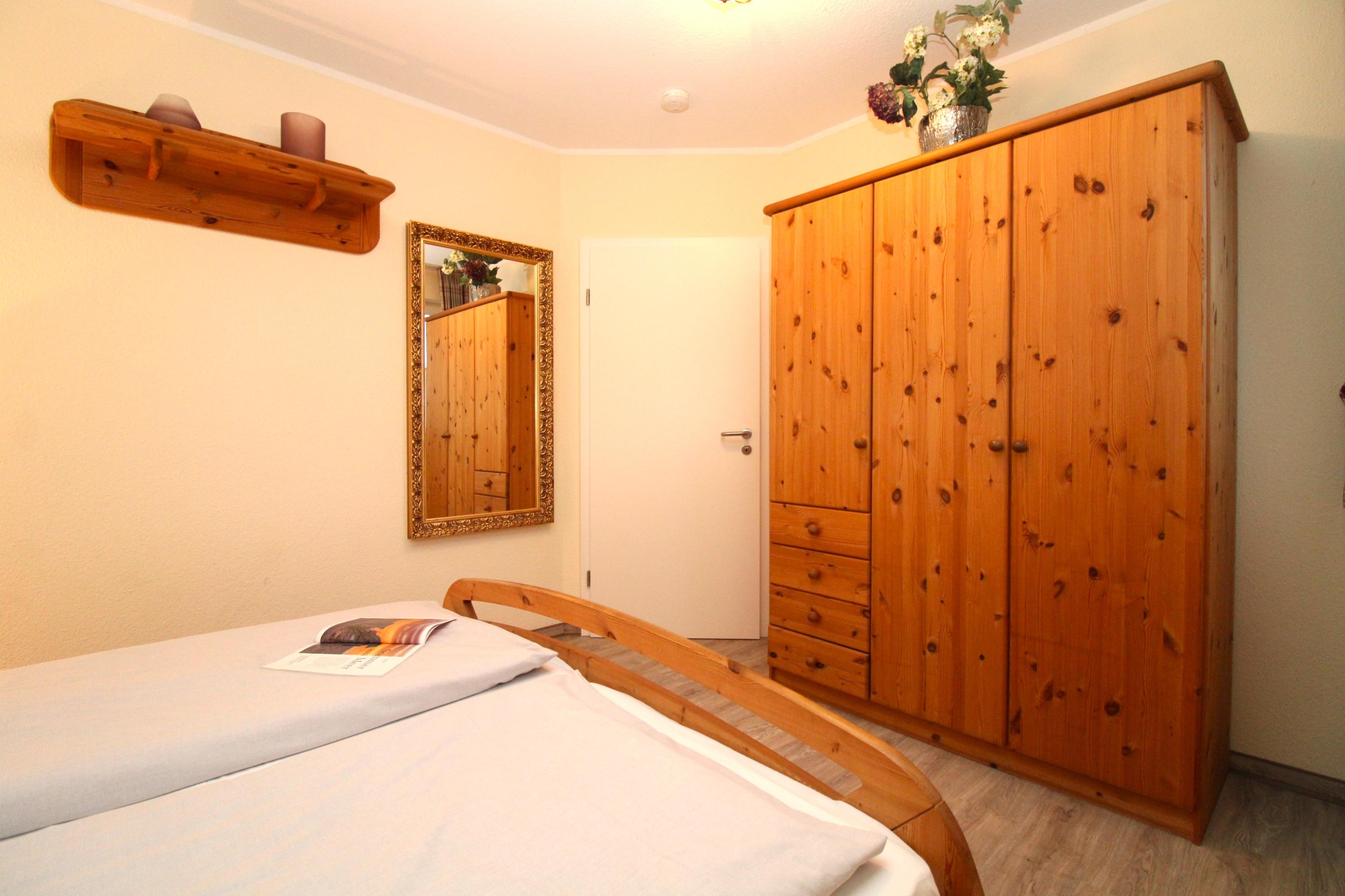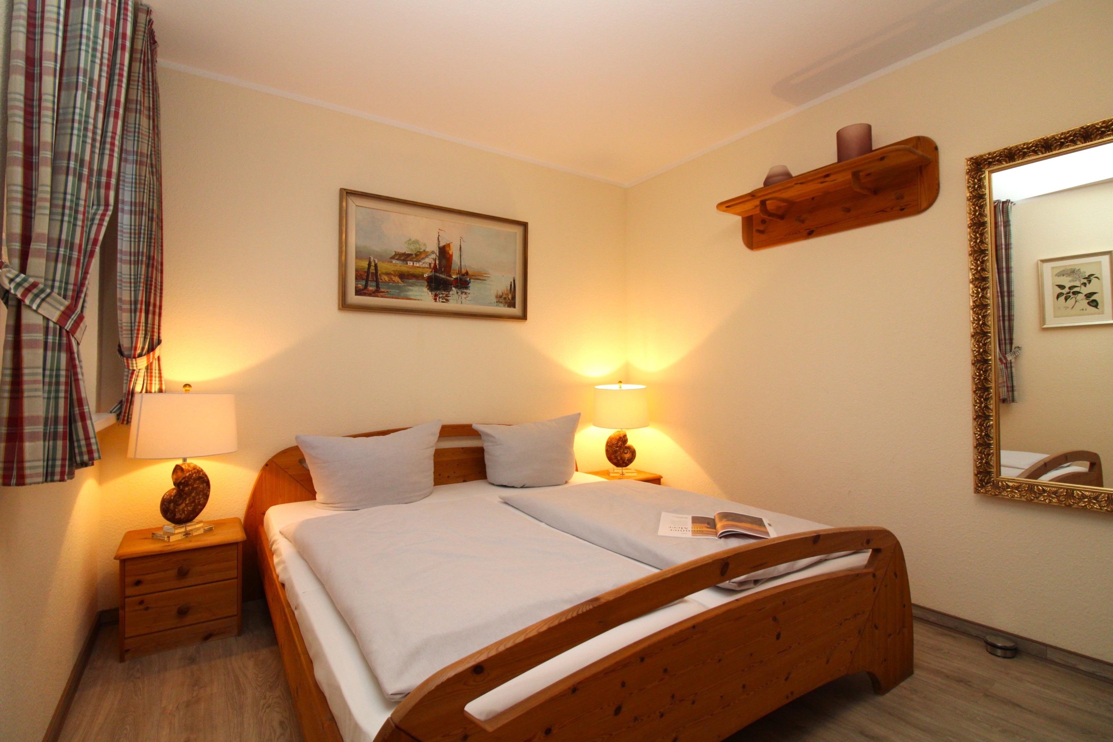 Das gemütliche Schlafzimmer ist mit einem bequemen Doppelbett (2 x 80 cm x 200 cm), Nachttischen mit Nachttischlampen, einem geräumigen Kleiderschrank sowie einem großen Wandspiegel eingerichtet. Für einen guten Schlafkomfort ist das Schlafzimmer mit Verdunkelungs-Vorhängen bzw. Rollos ausgestattet.