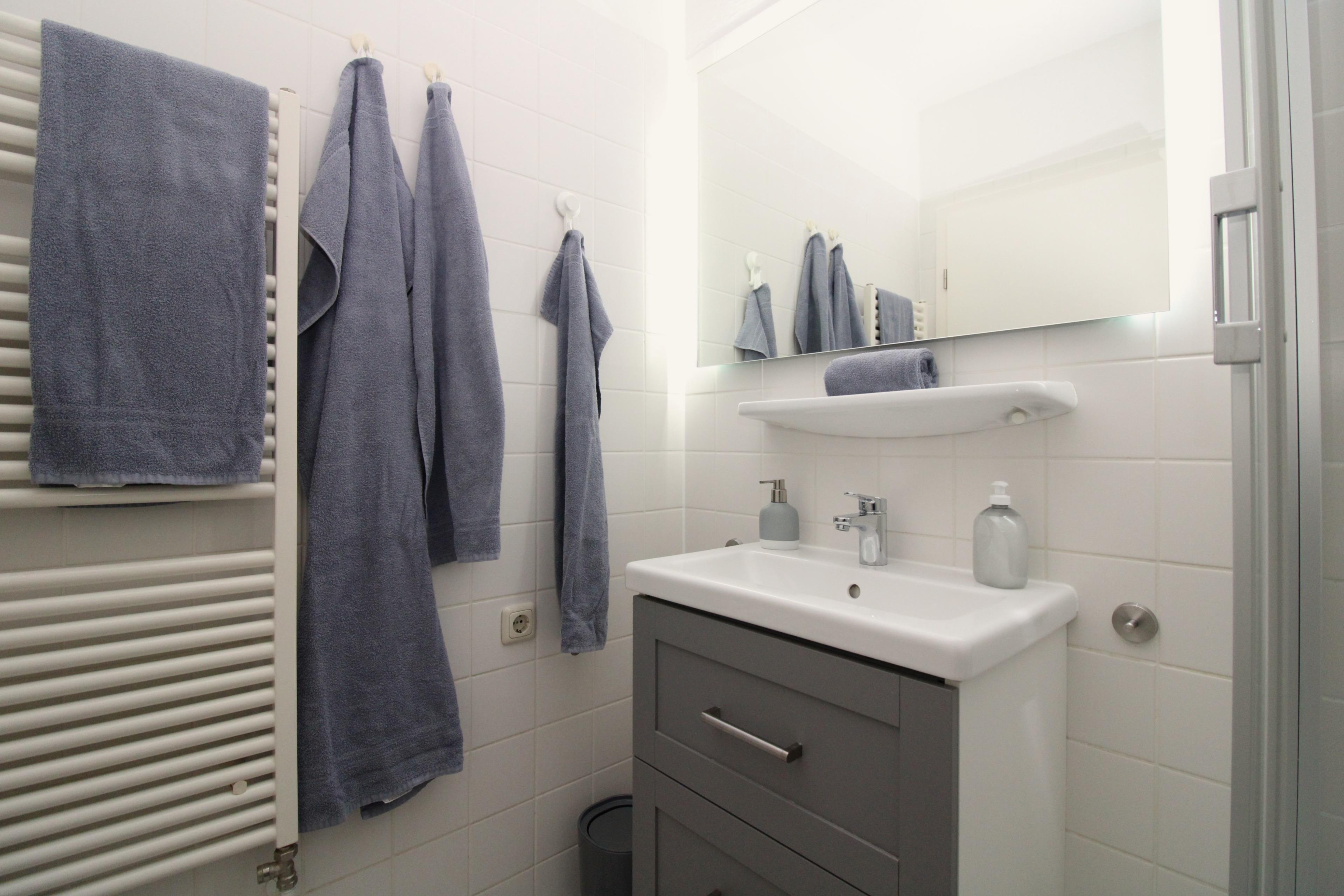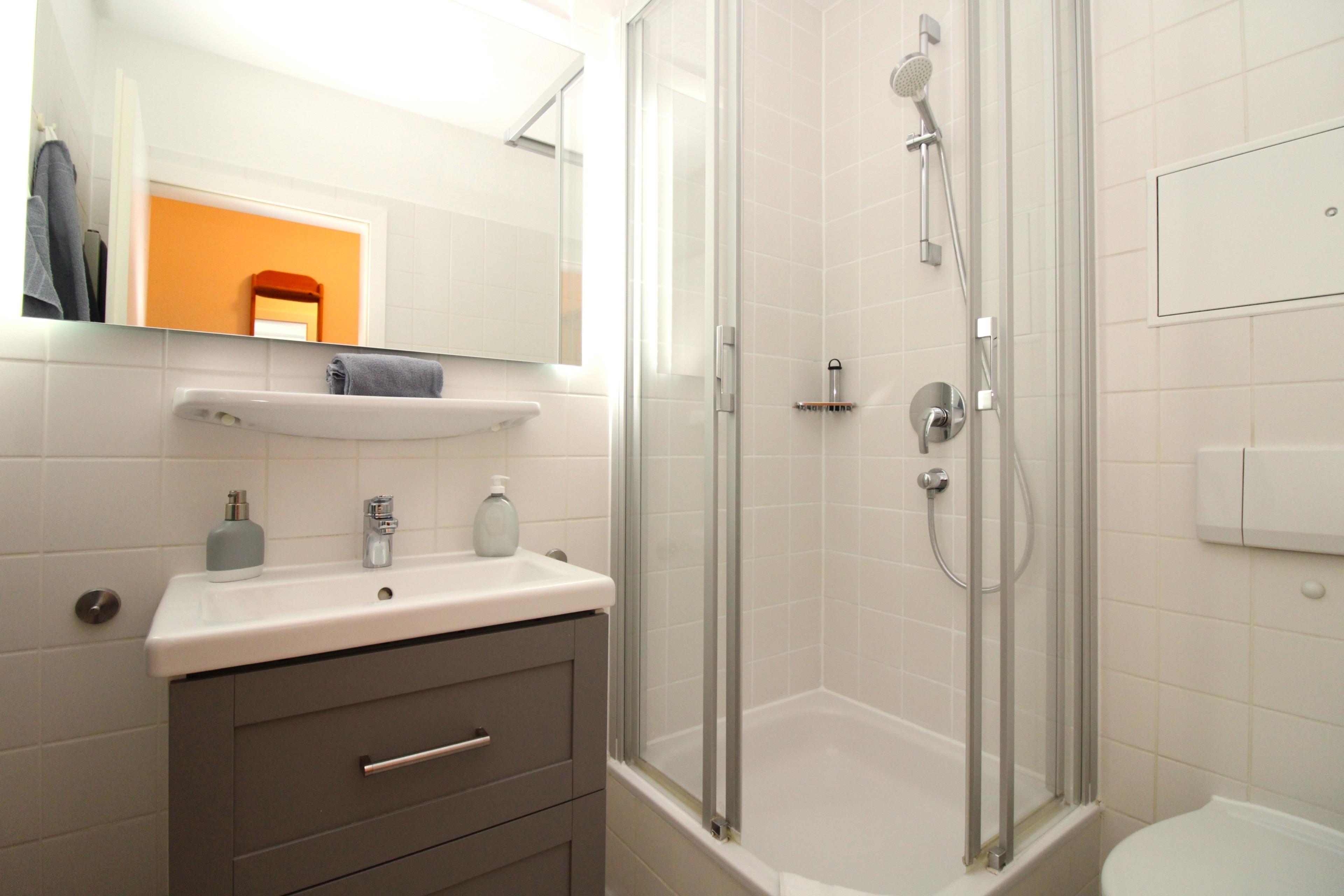Das moderne Badezimmer verfügt über eine Dusche mit Echtglas-Abtrennung, Waschbecken mit Unterschrank, WC, Handtuch-Heizkörper, Föhn sowie ausreichend Ablagemöglichkeiten.