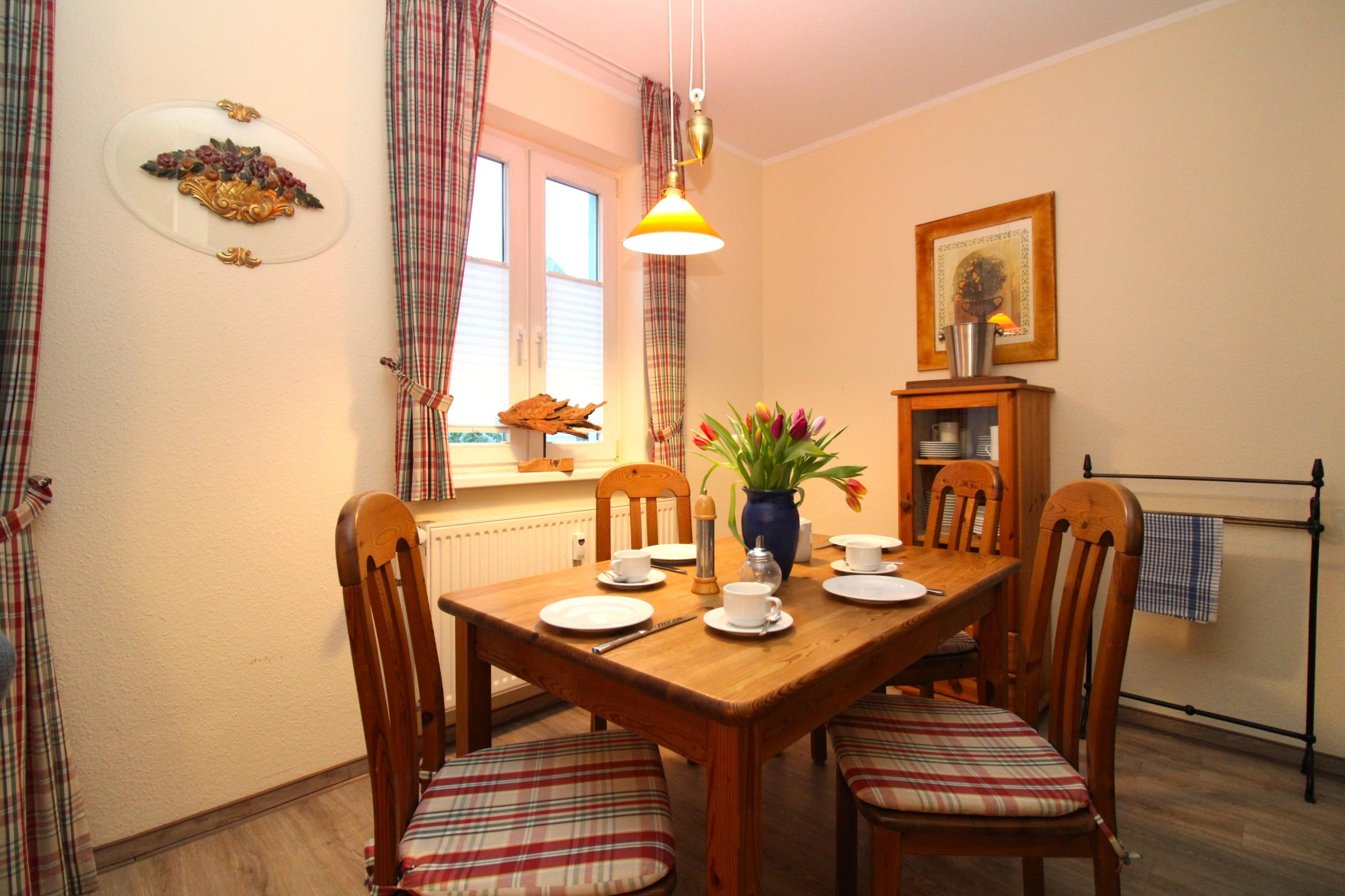 Das geräumige Wohn-/Esszimmer verfügt über eine separate Sitzgruppe mit bequemer Couch, Sessel und Couchtisch, einen separaten Esstisch mit 4 Stühlen, ein Sideboard sowie 2 Kommoden. Vom Wohnzimmer aus haben Sie direkten Zugang zu der ca. 4 m² großen möblierten Terrasse (nach Nord-Osten zum Innenhof ausgerichtet). Hier sitzen Sie entspannt und gemütlich und können abends bei einem guten Glas Wein in Ruhe die lauen Sommernächte genießen.