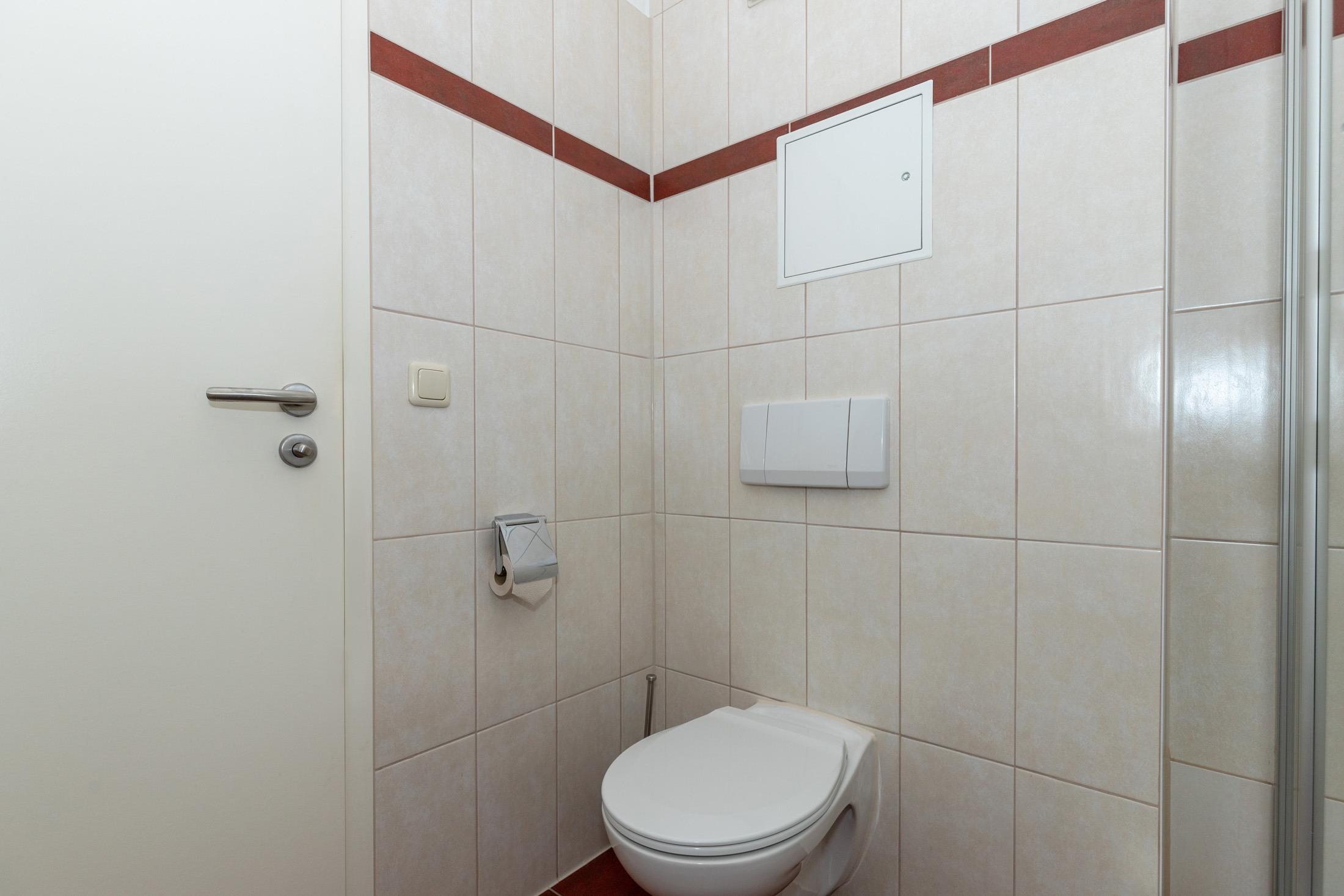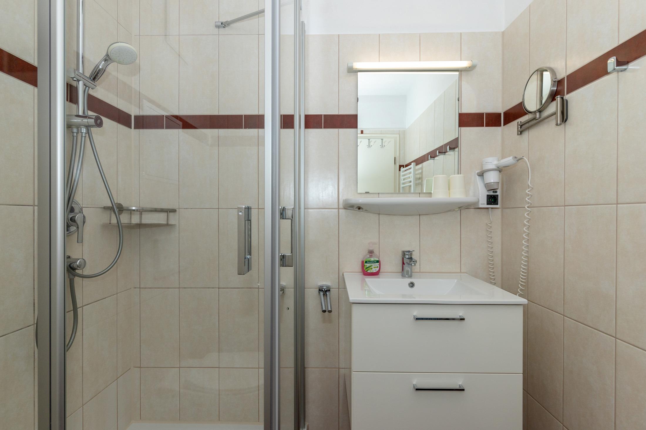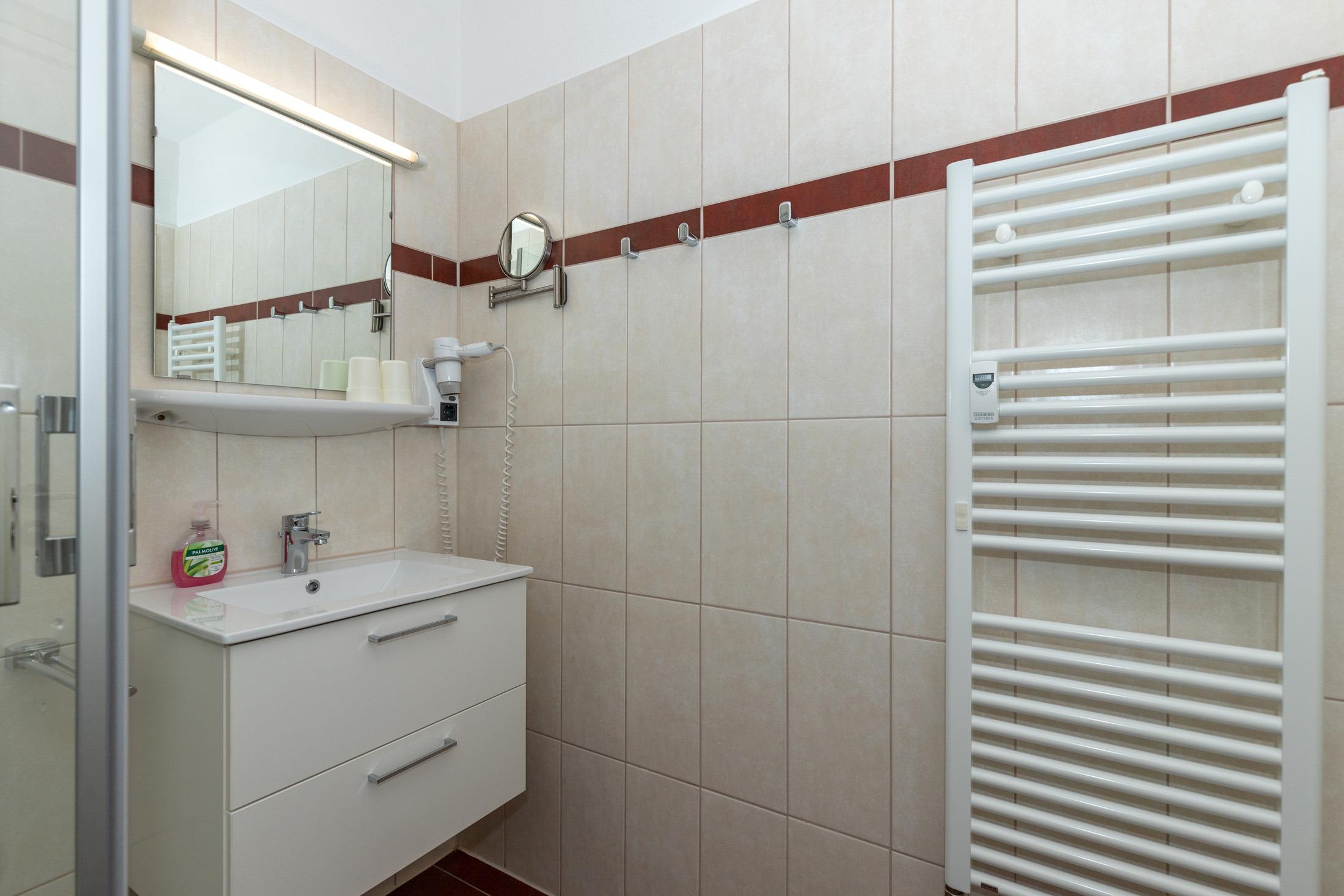 Das moderne Badezimmer verfügt über eine Echtglas-Dusche (seniorenfreundlich (!) mit niedrigem Einstieg) mit integrierter Regenbrause, Waschbecken mit Unterschrank, WC, Föhn, Kosmetikspiegel, Handtuch-Heizkörper sowie ausreichend Ablagemöglichkeiten.
