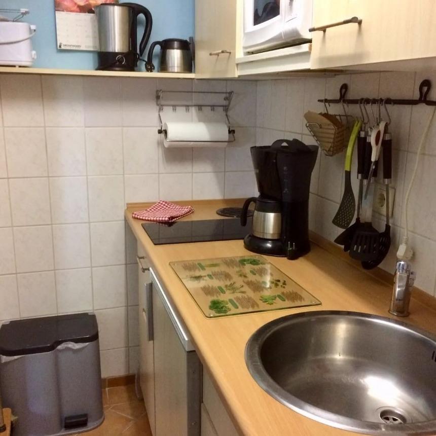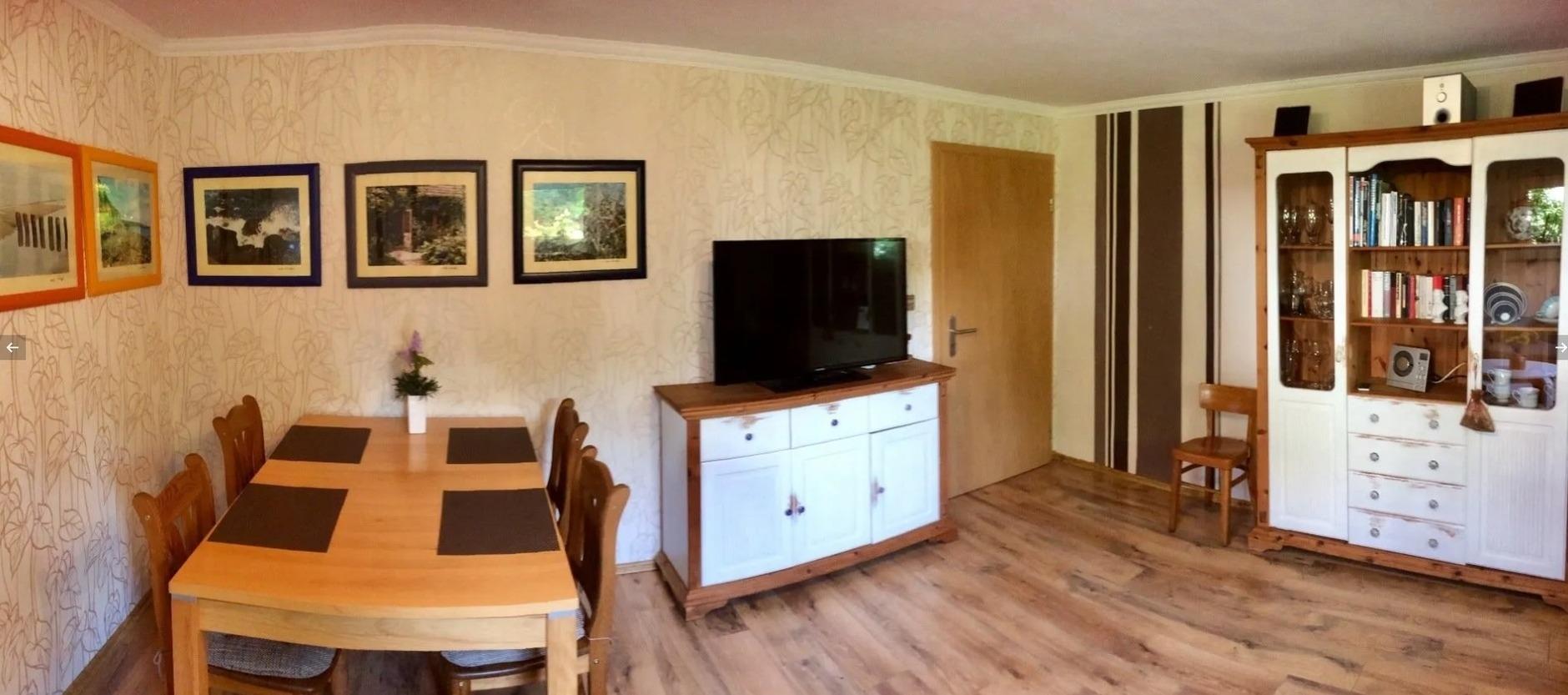 Die Ferienwohnung ist etwa 45qm groß und besteht aus einem Wohnzimmer mit Schlafcouch,TV-Flachbildschirm und Radio. Ein gefüllter Bücherschrank und Spiele sind ebenfalls vorhanden. Ein gemütlicher Essplatz für 4 Personen komplettiert das Zimmer.