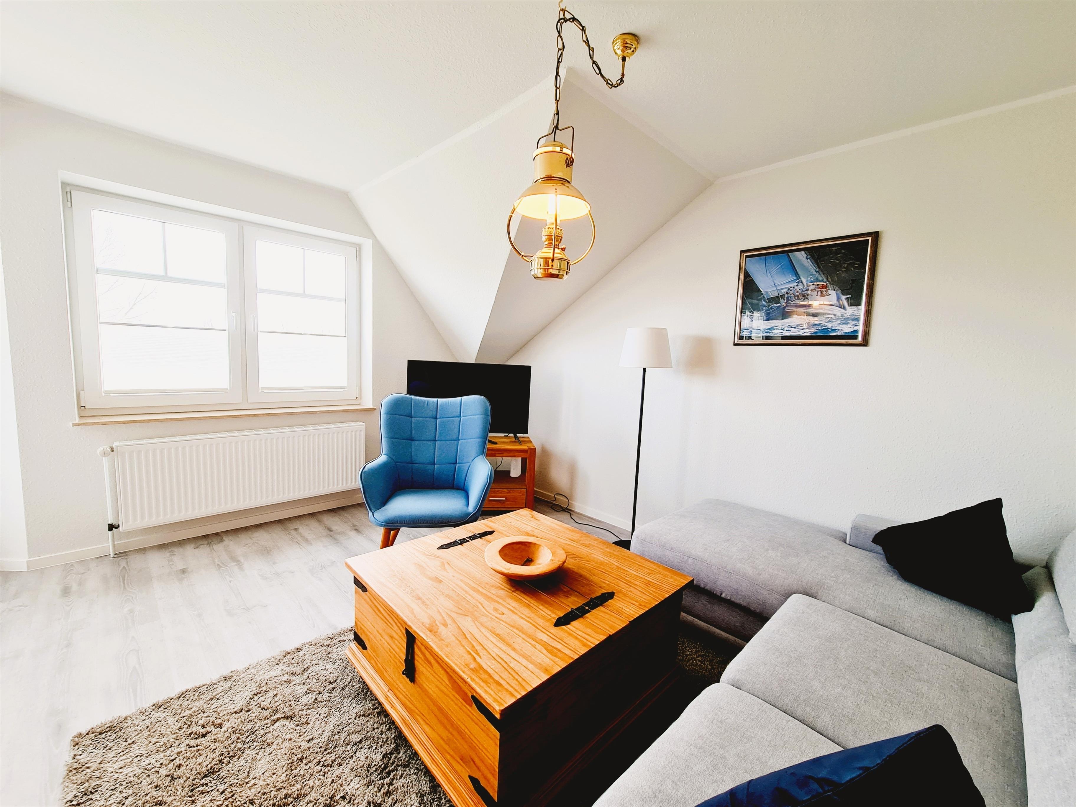 Die helle, sonnige, etwa 50 m² große Wohnung befindet sich im Obergeschoss und ist für 4 Personen geeignet. Sie erstreckt sich über 2 Ebenen, die durch eine kleine Treppe im Wohnzimmer verbunden sind. Die Wohnung wurde liebevoll im maritimen Stil eingerichtet und komfortabel ausgestattet, so dass Sie sich wohlfühlen können.