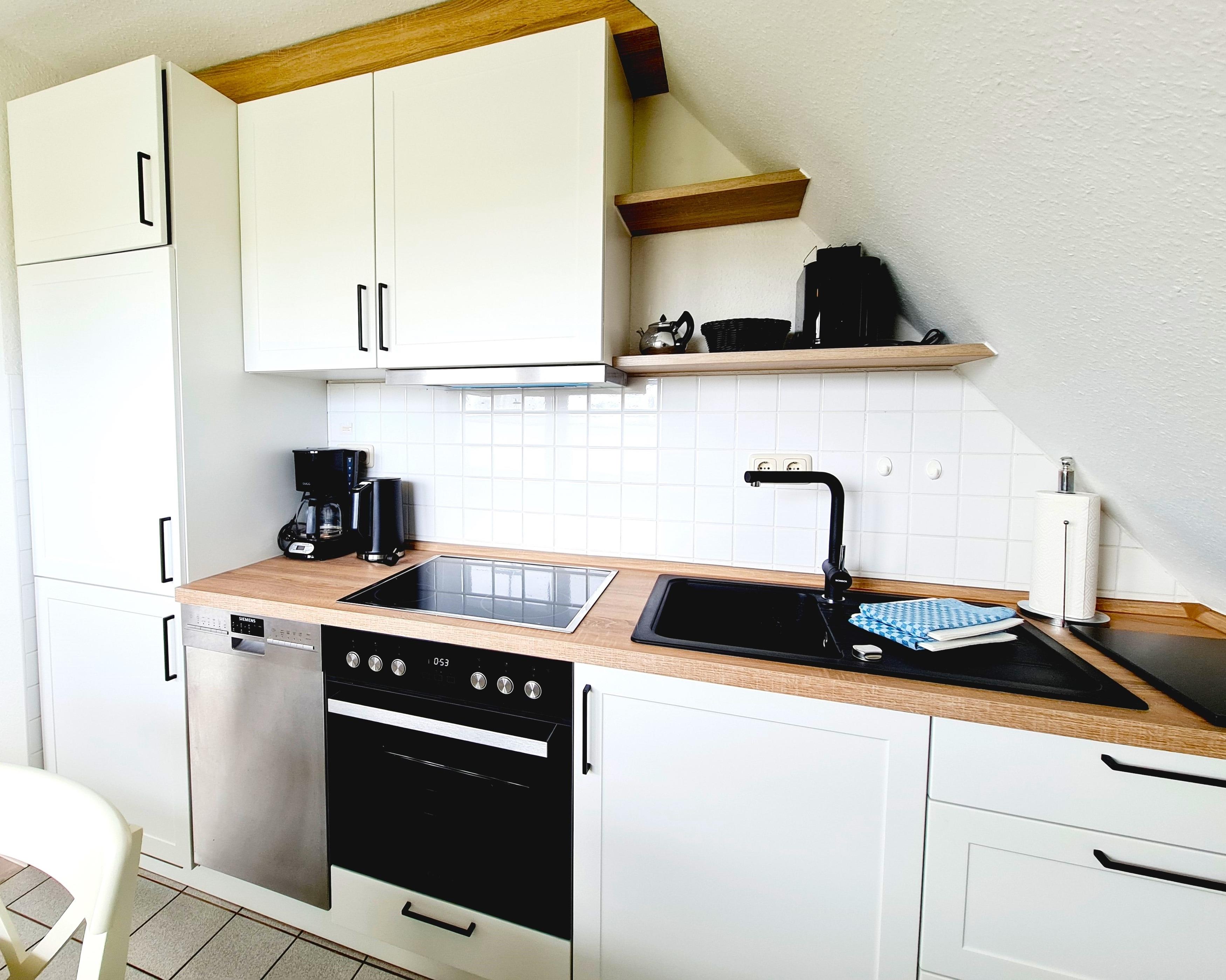 Komfortausstattung: Geschirrspüler, Ceranfeld, Backofen, Kühlschrank mit Tiefkühlfach,